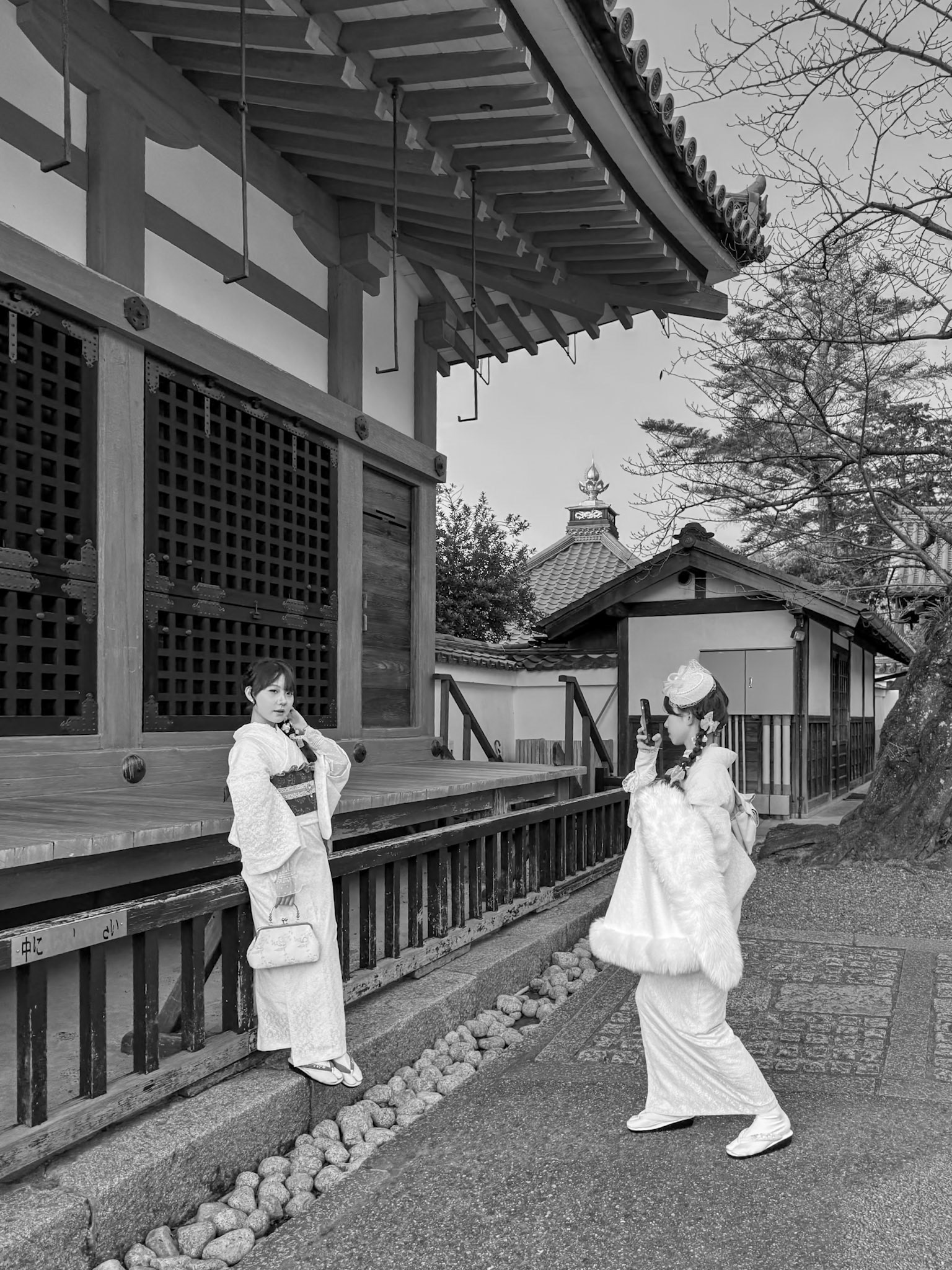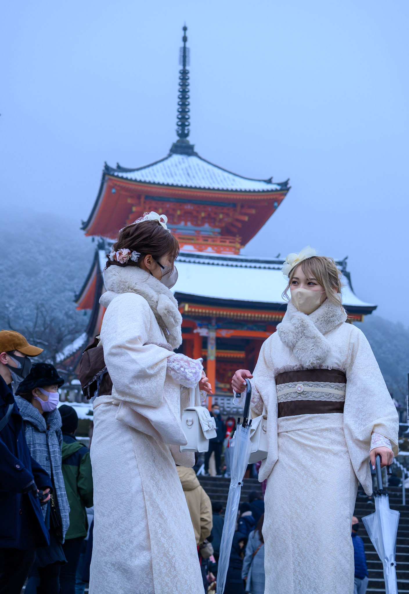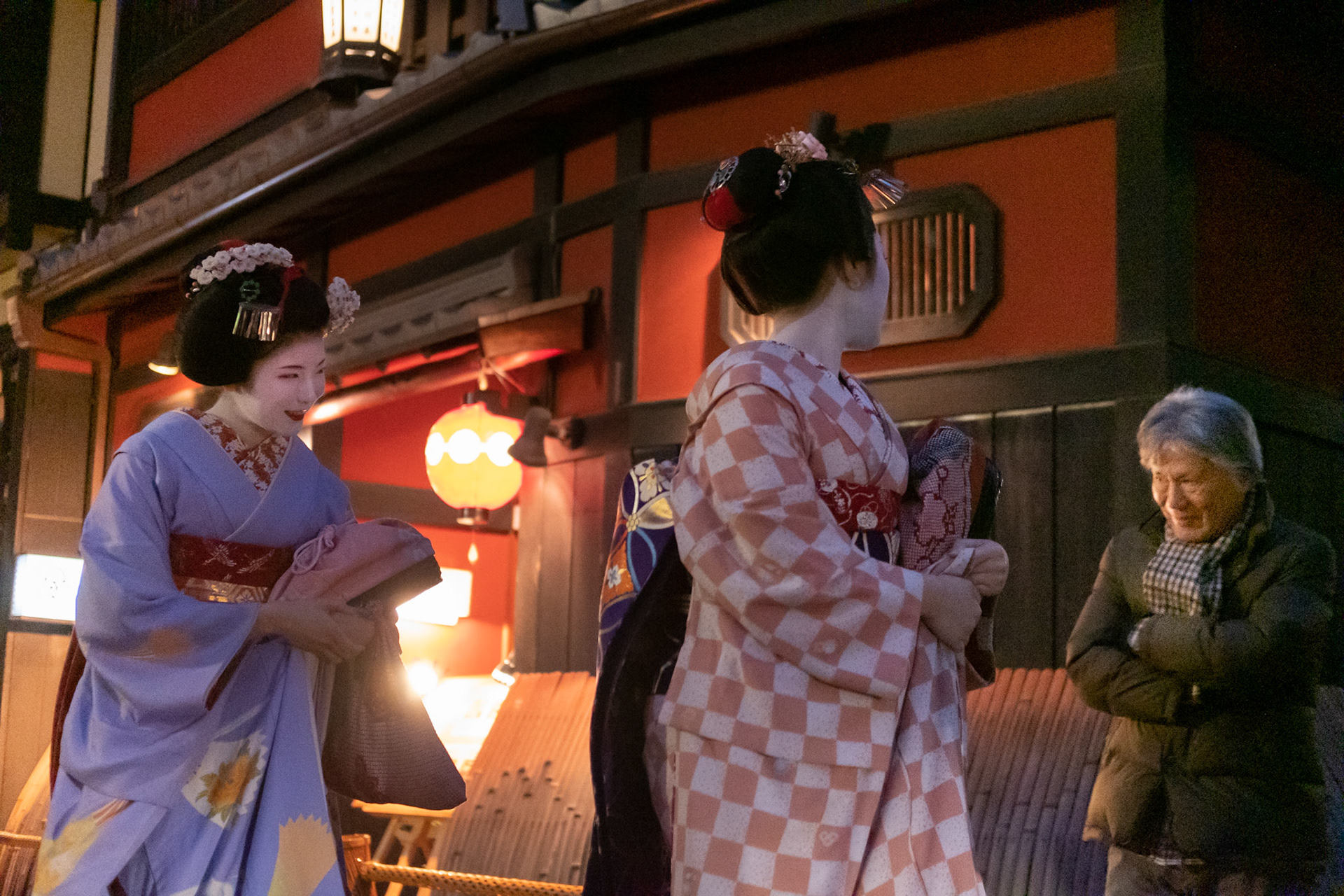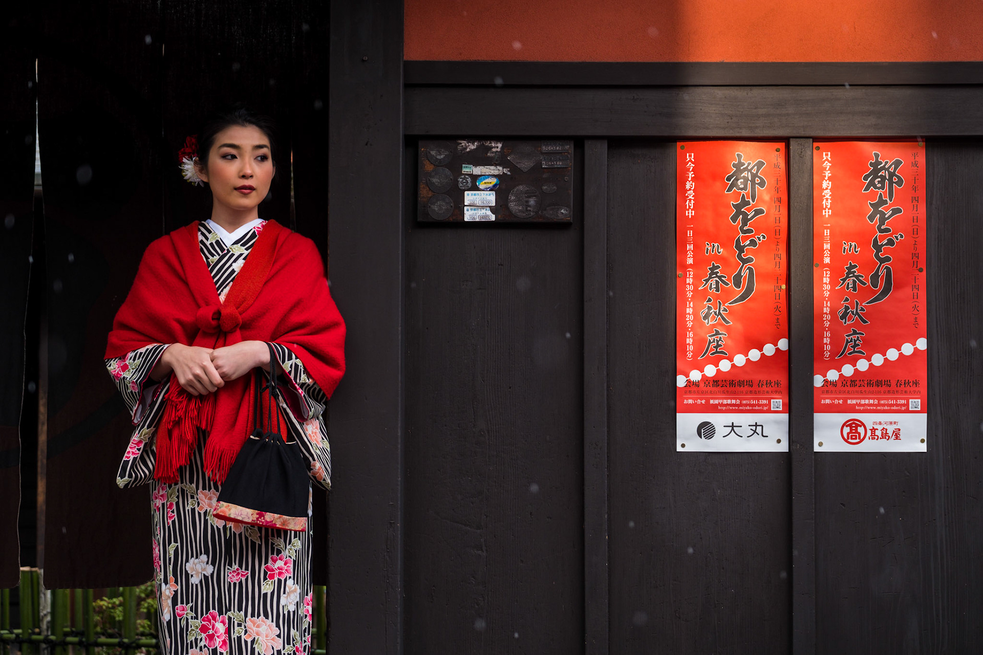 Friends wearing kimono enjoy photographing each other during a snow shower in the Gion district of Kyoto.