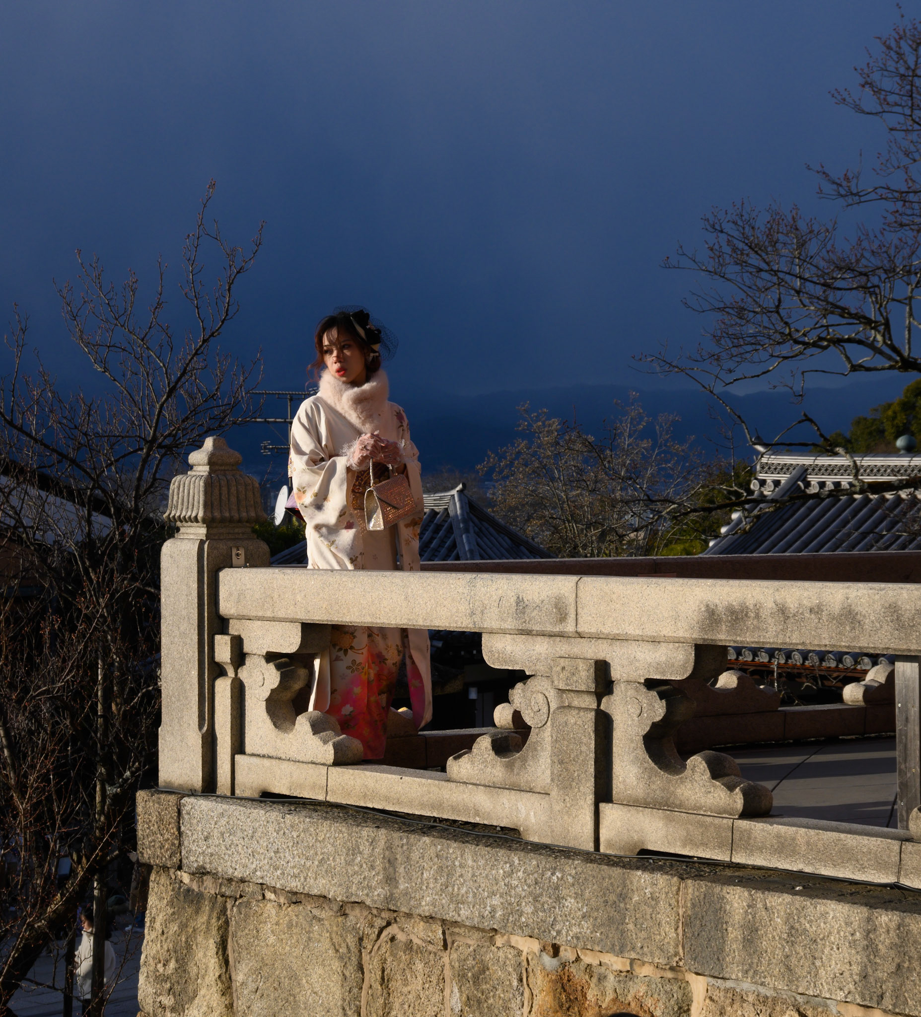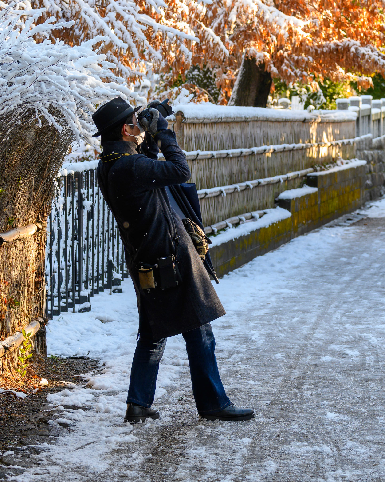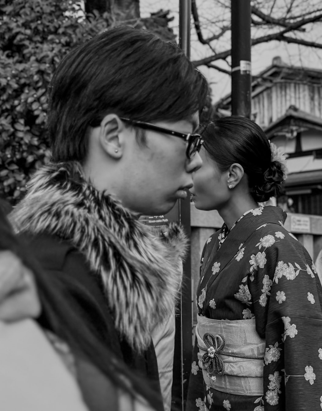 Friends wearing kimono enjoy photographing each other during a snow shower in the Gion district of Kyoto.