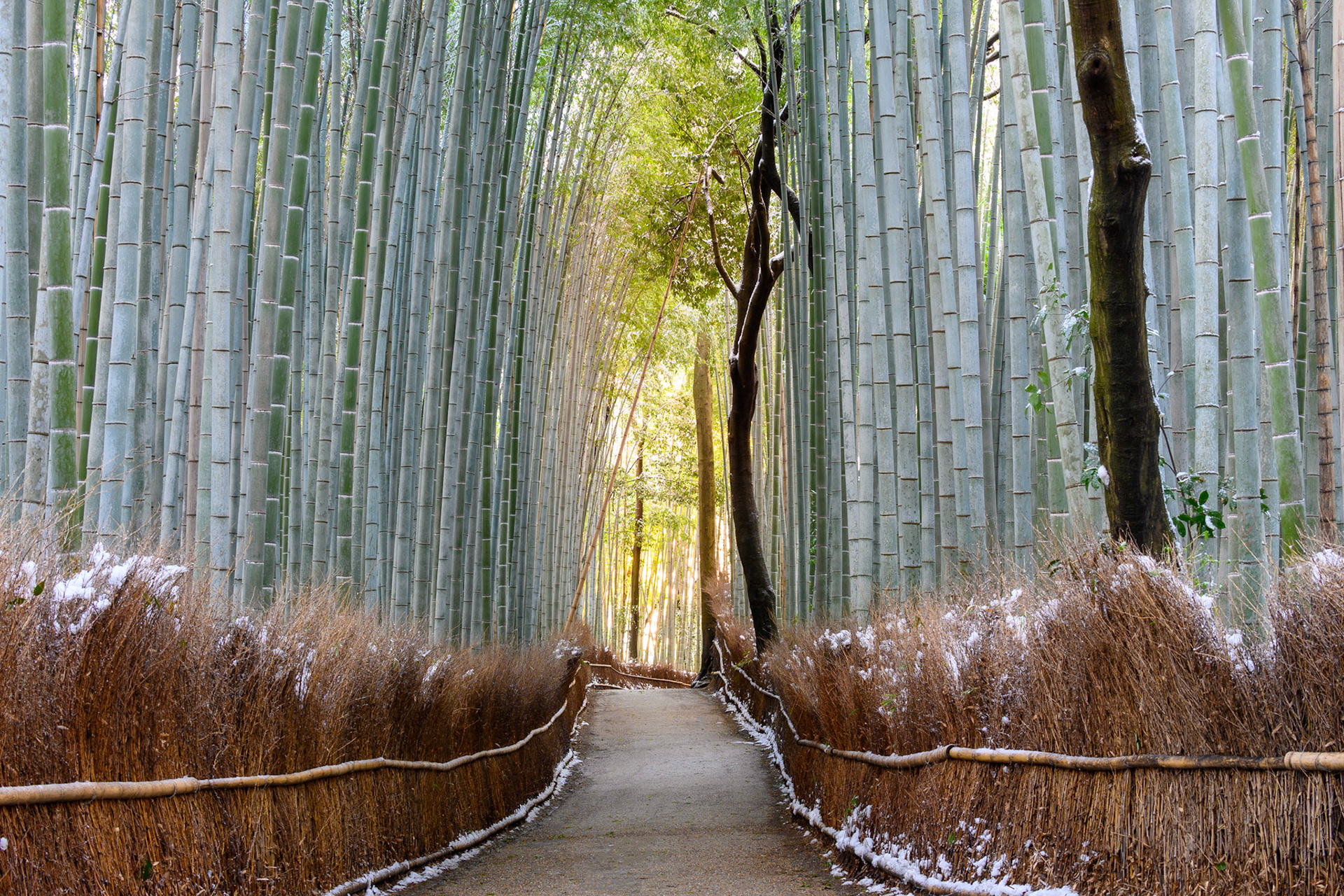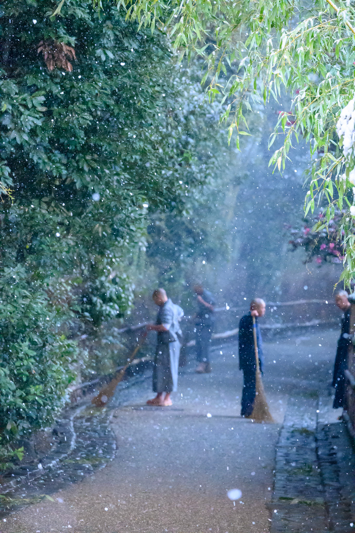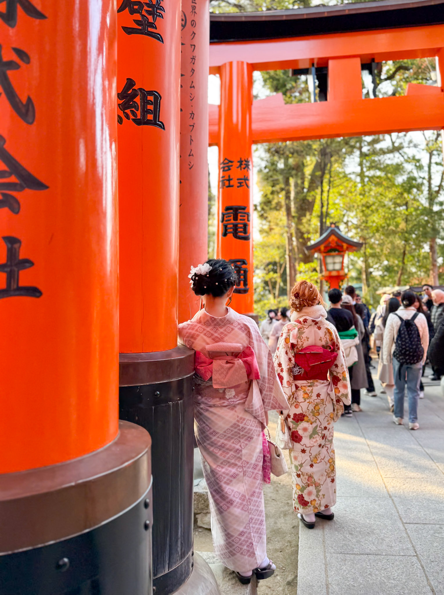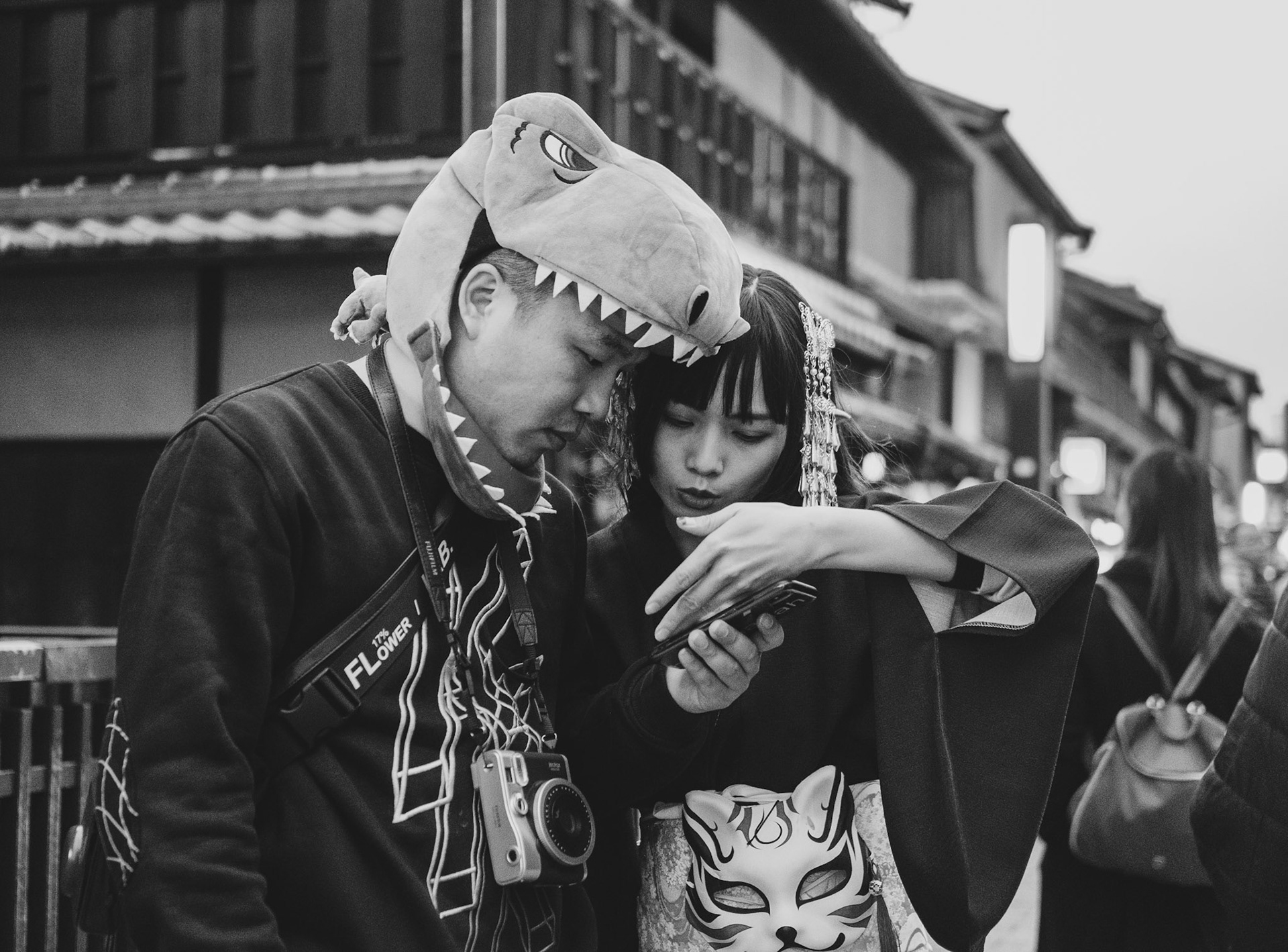 Friends wearing kimono enjoy photographing each other during a snow shower in the Gion district of Kyoto.
