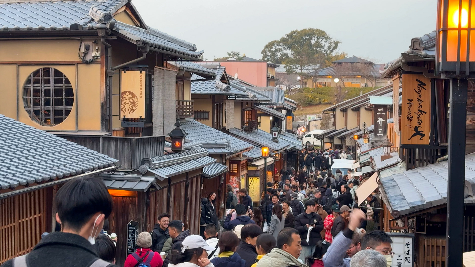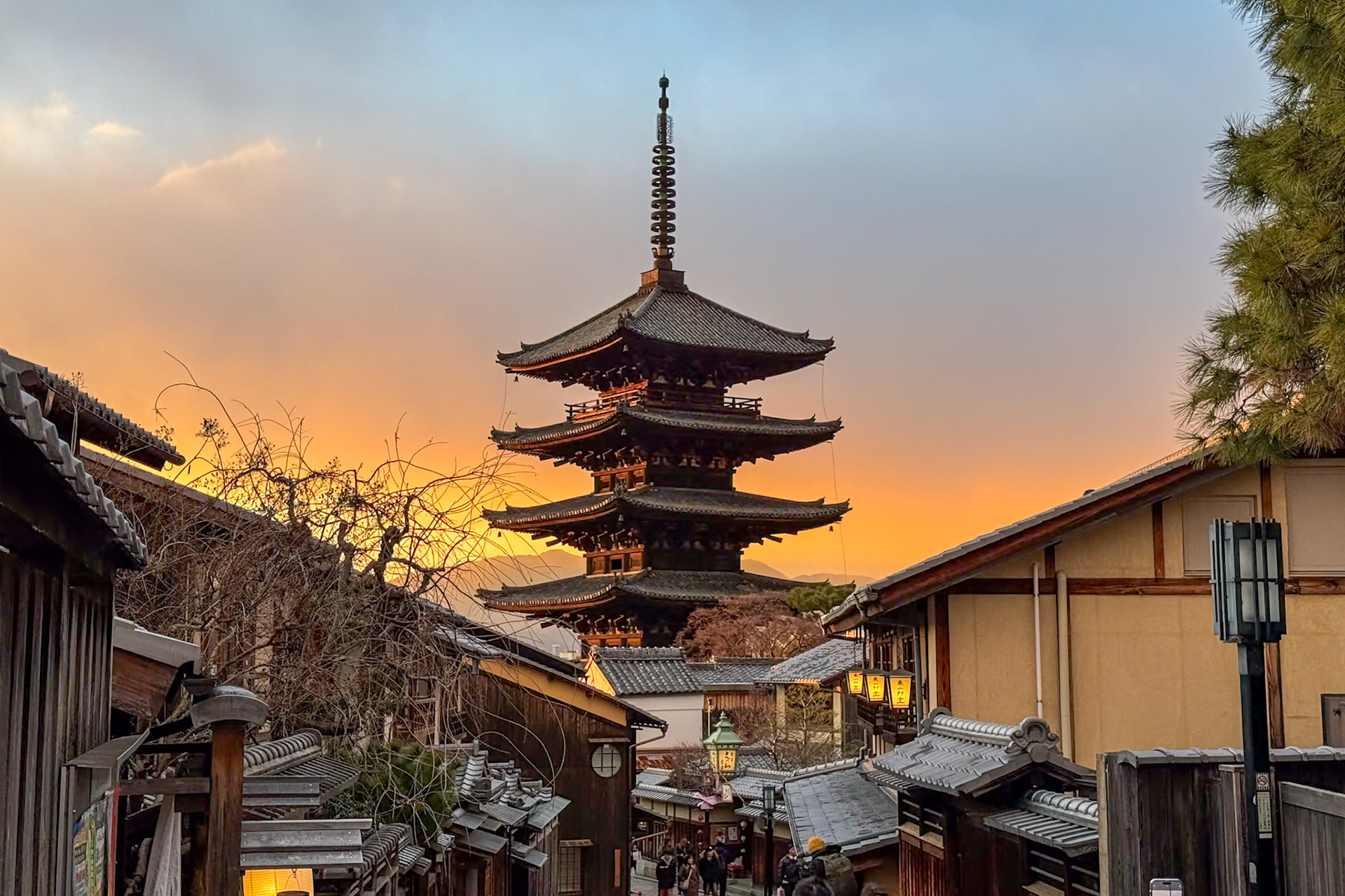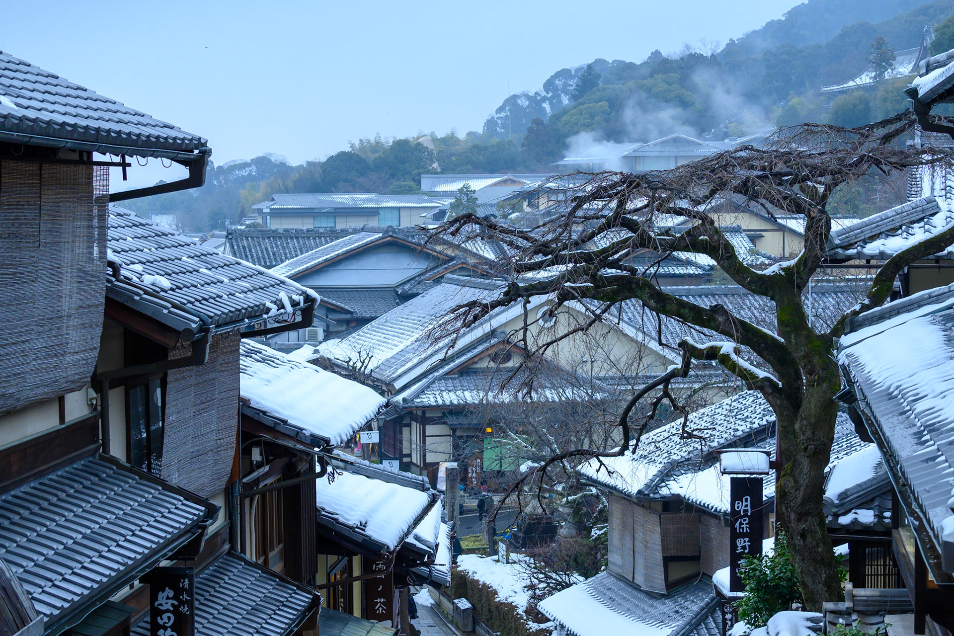 Traditional houses and shop rooflines during a snow shower in the ninenzaka and sannenzaka area of Higashiyama, Kyoto.