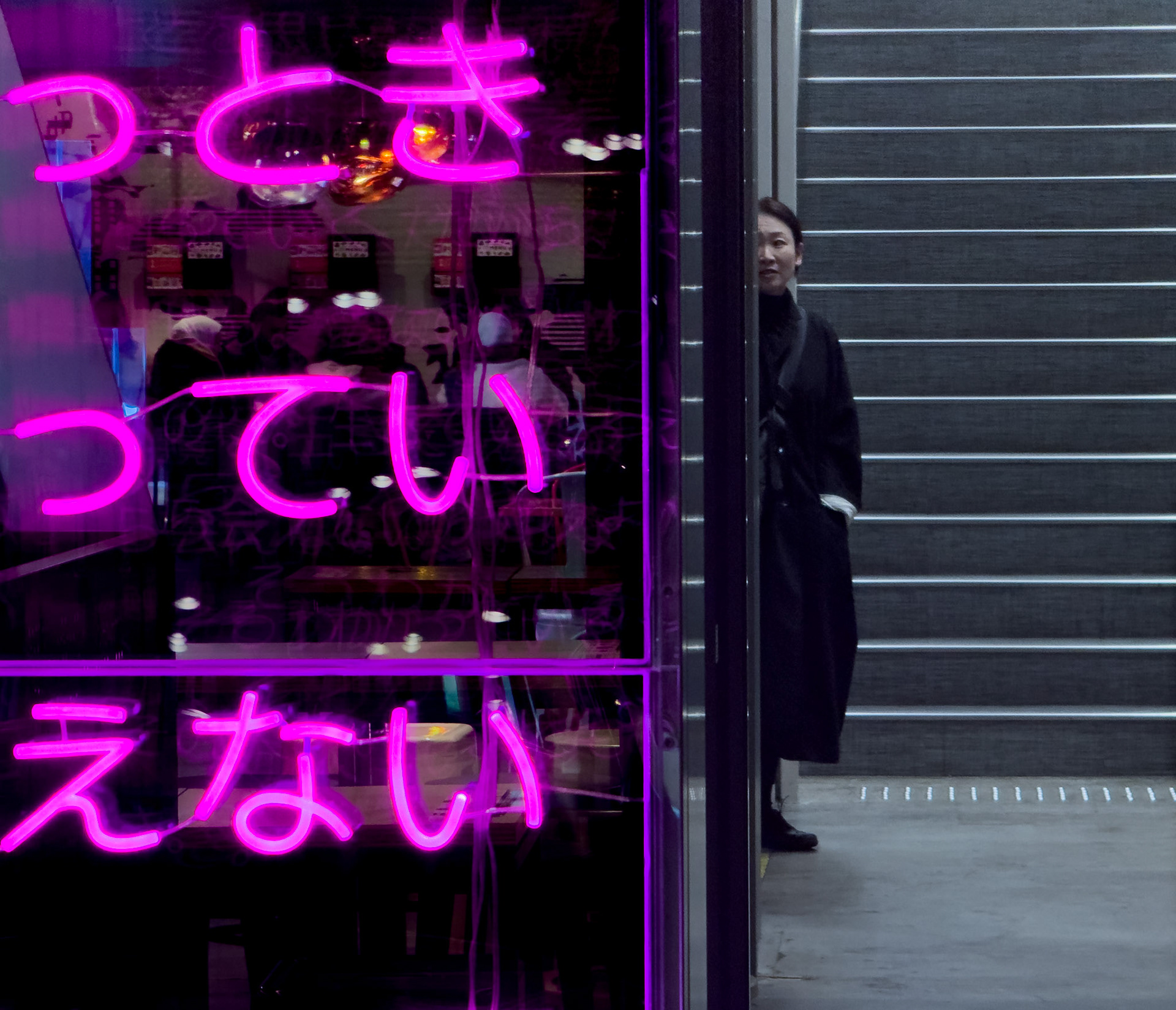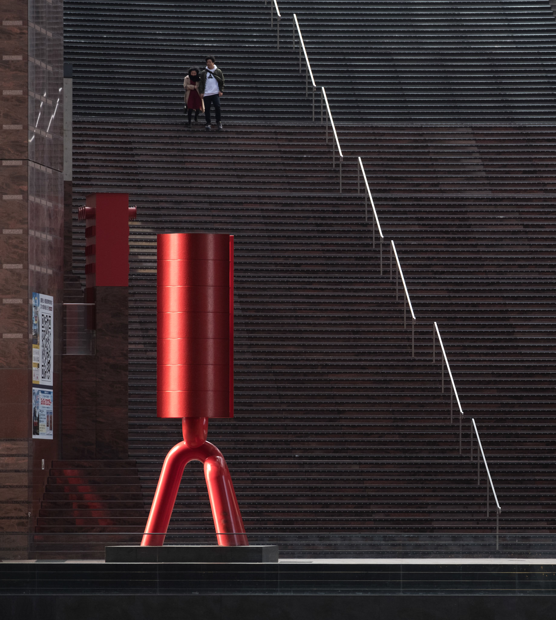 A woman walks up the LED light illuminated stairs inside Kyoto Station.