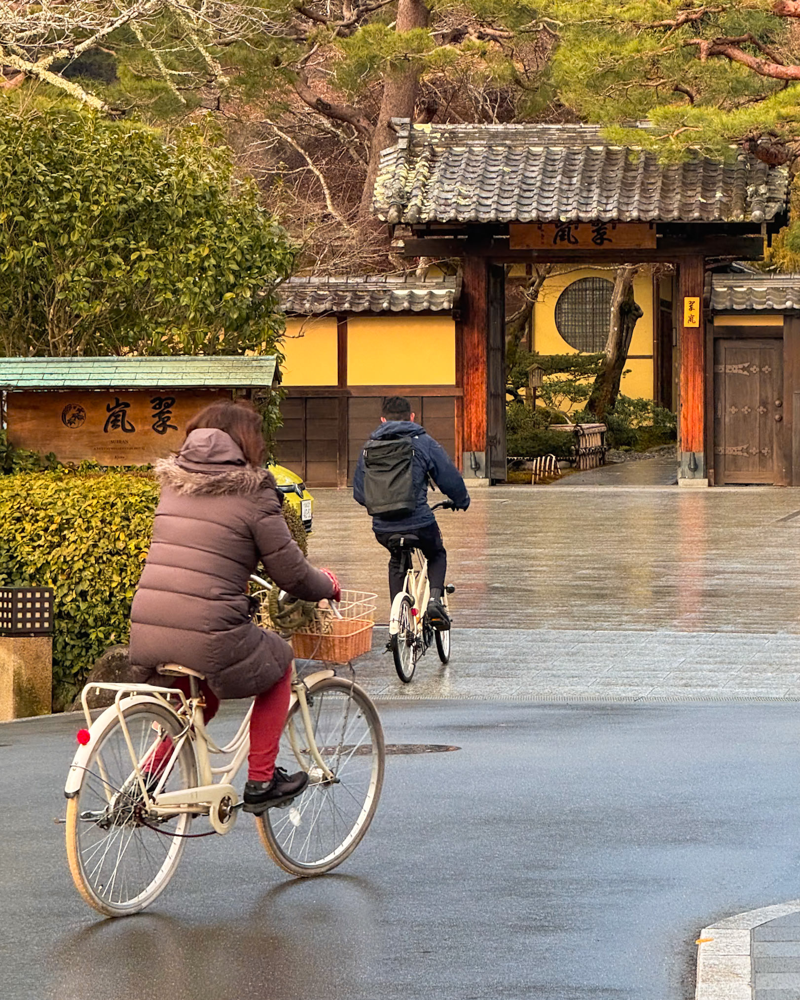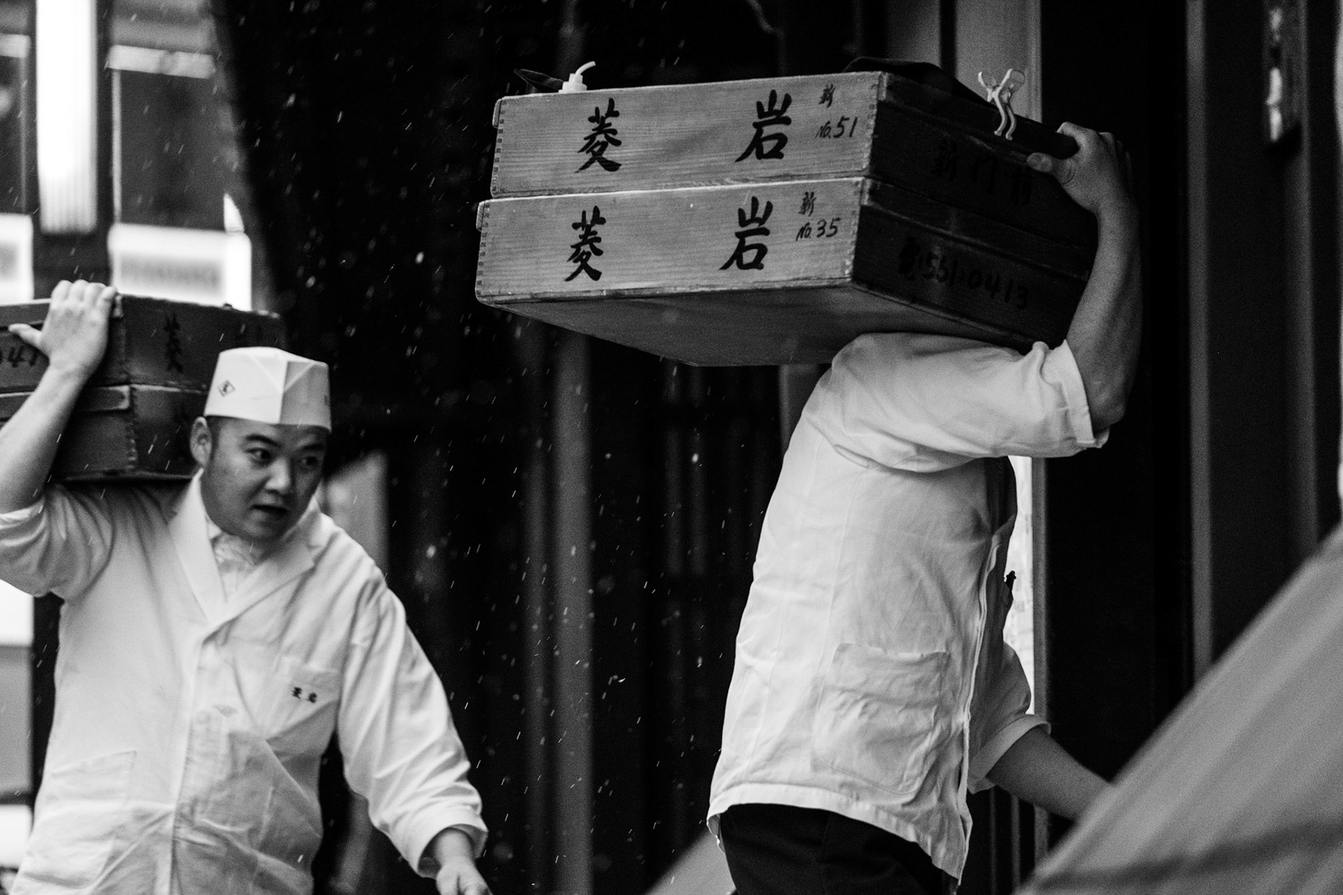 Delivery man to the famous Ichirikitei tea house battles the driving snow as he cycles back to his work.