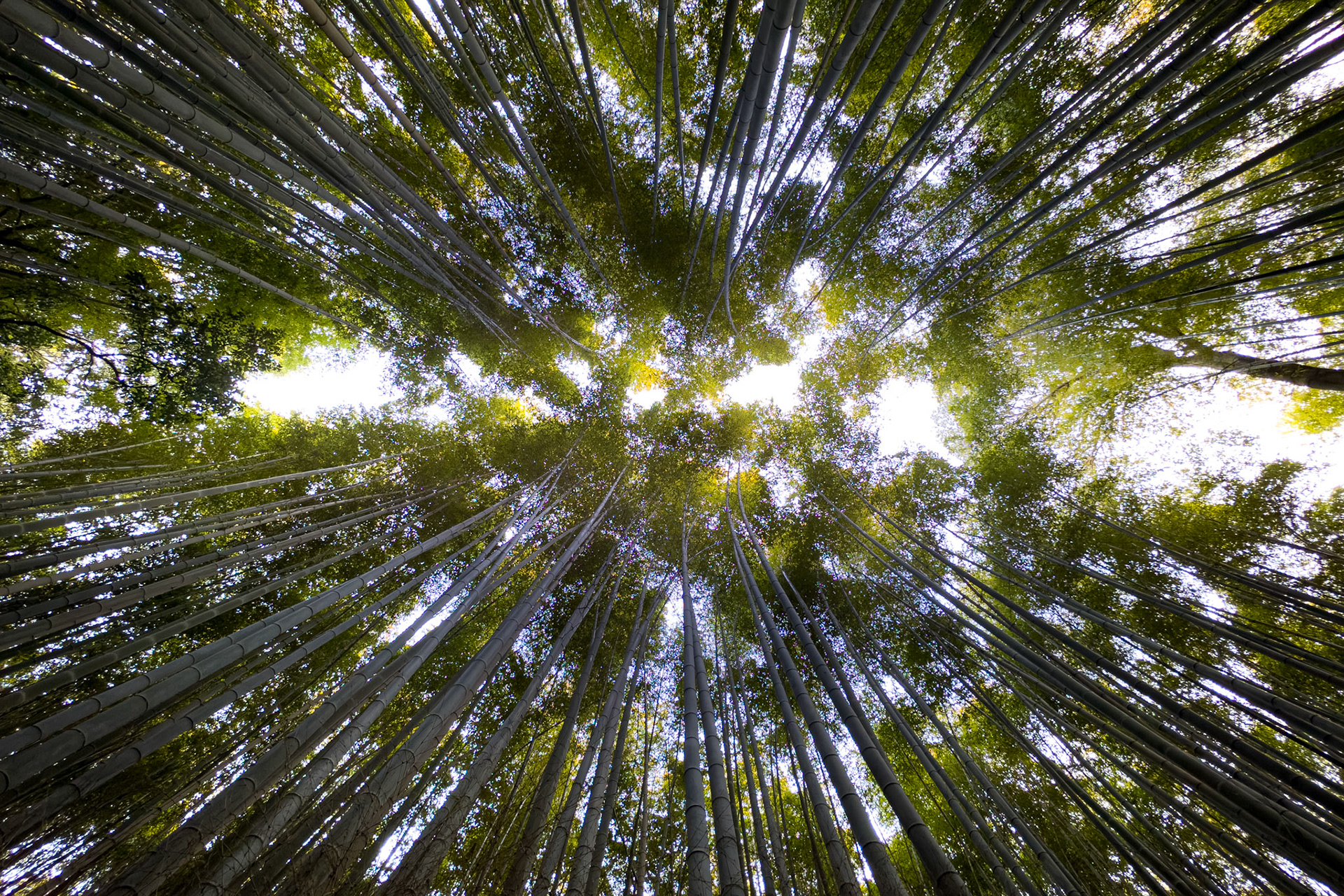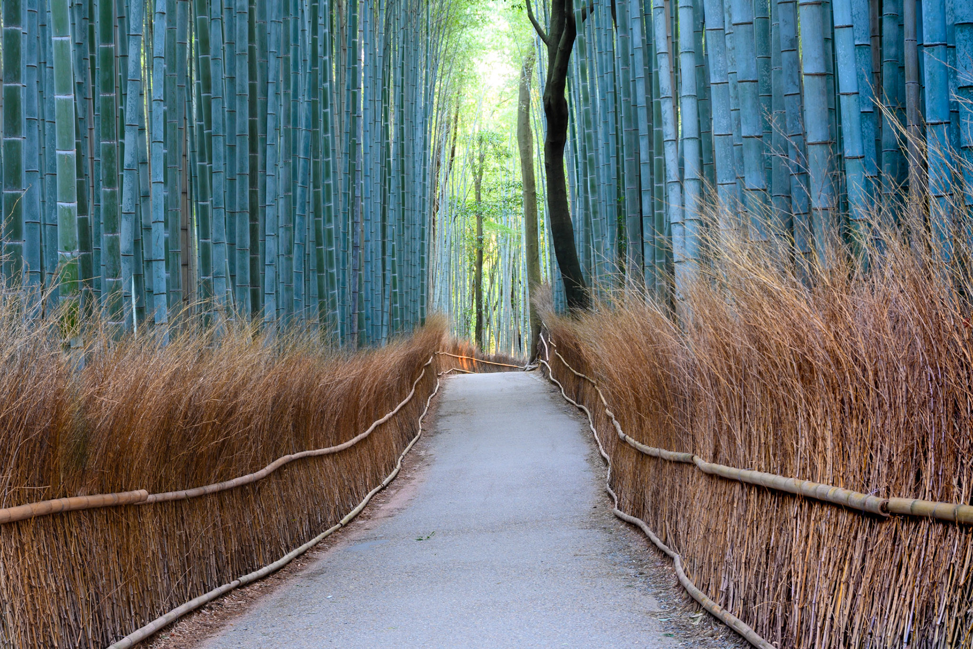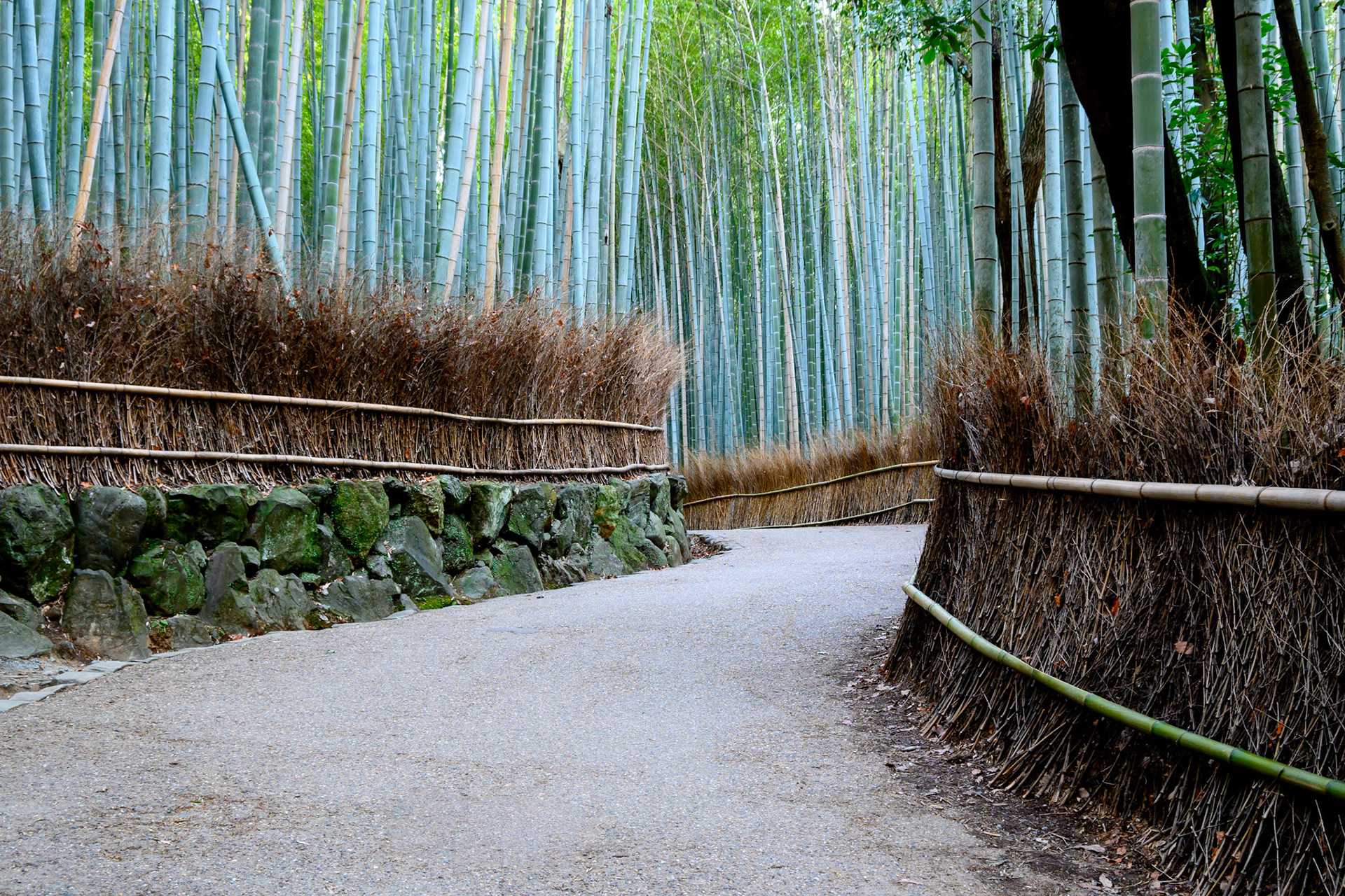 A couple stroll through the Shira-kawa area of Kyoto, wearing kimono and carrying umbrellas.