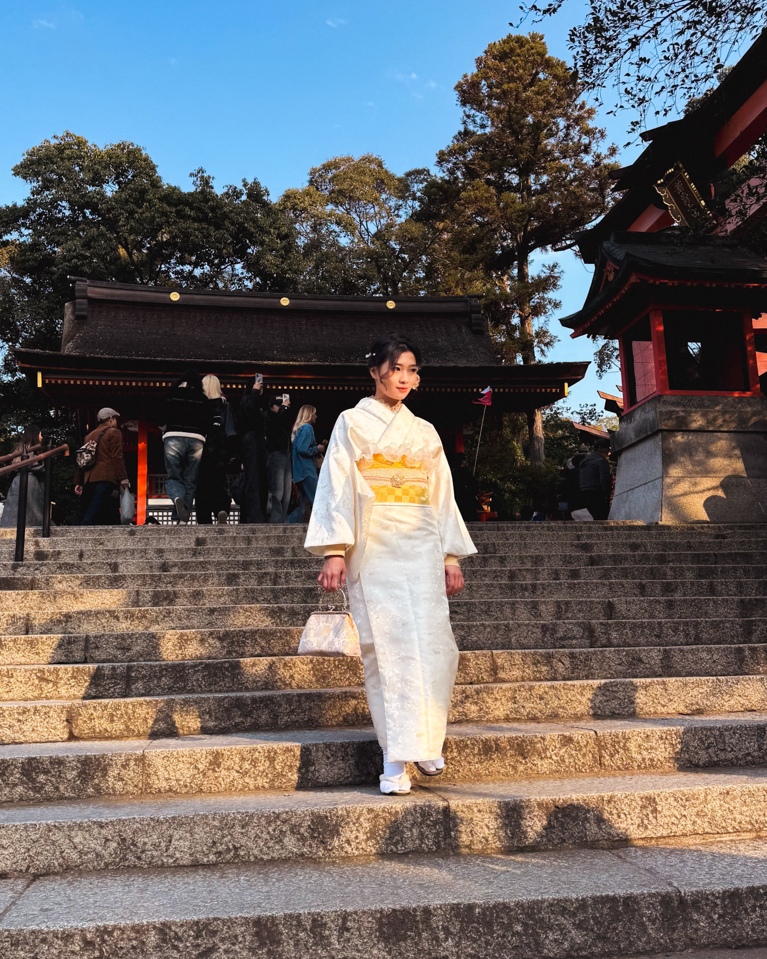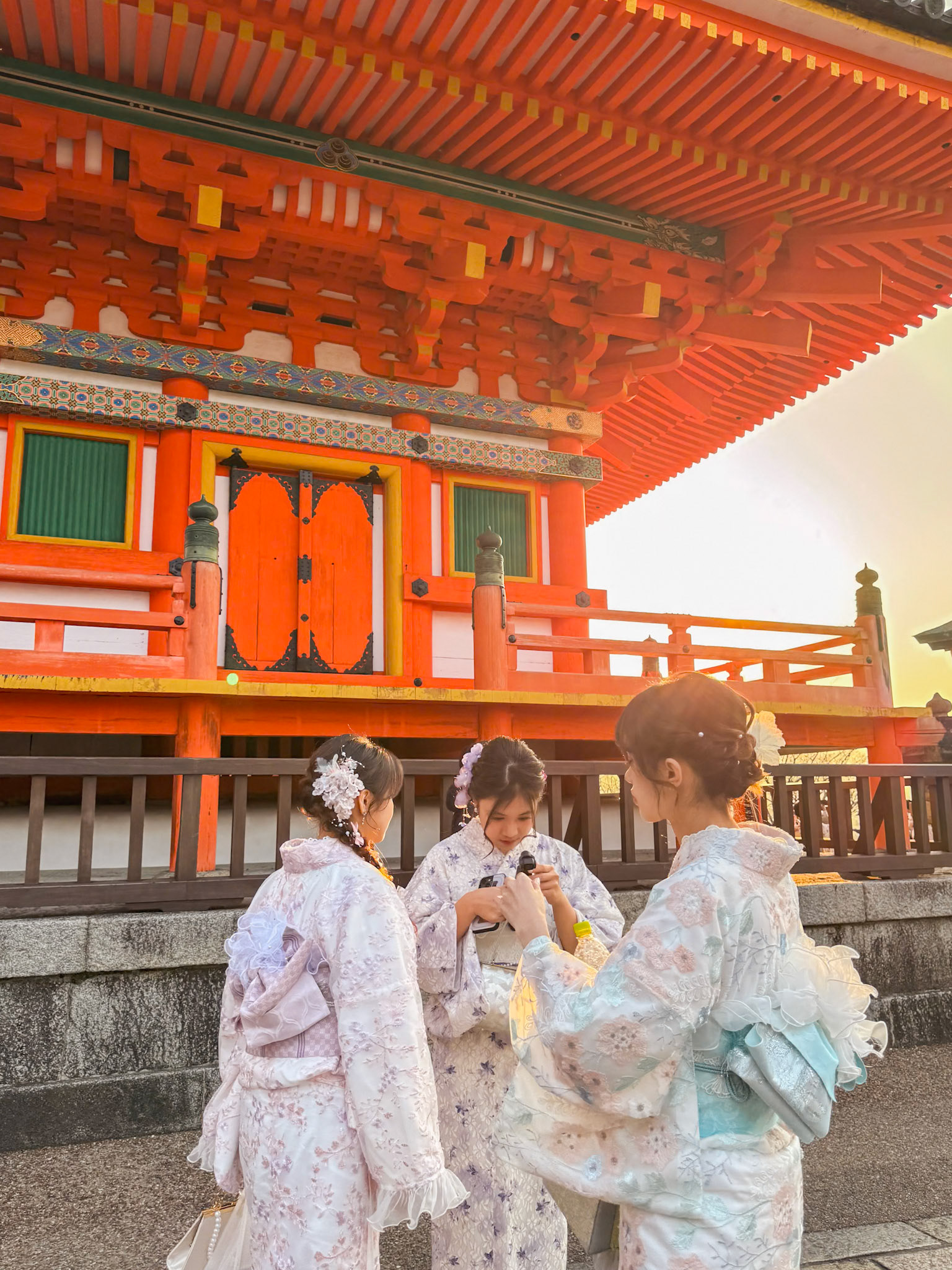 Freinds wearing kimonos eating lunch with chopsticks in the Ninenzaka and Sannenzaka area of Higashiyama, Kyoto.