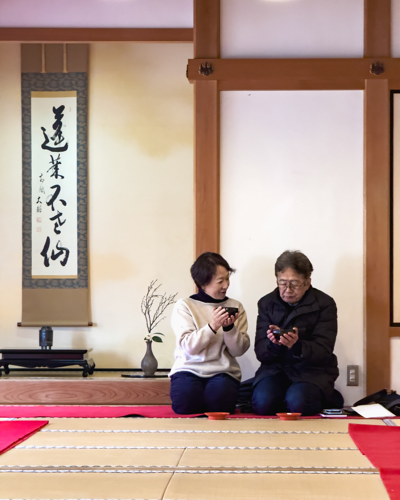 A view of an ikebana flower arrangement seen through a frosty window in Kyoto.