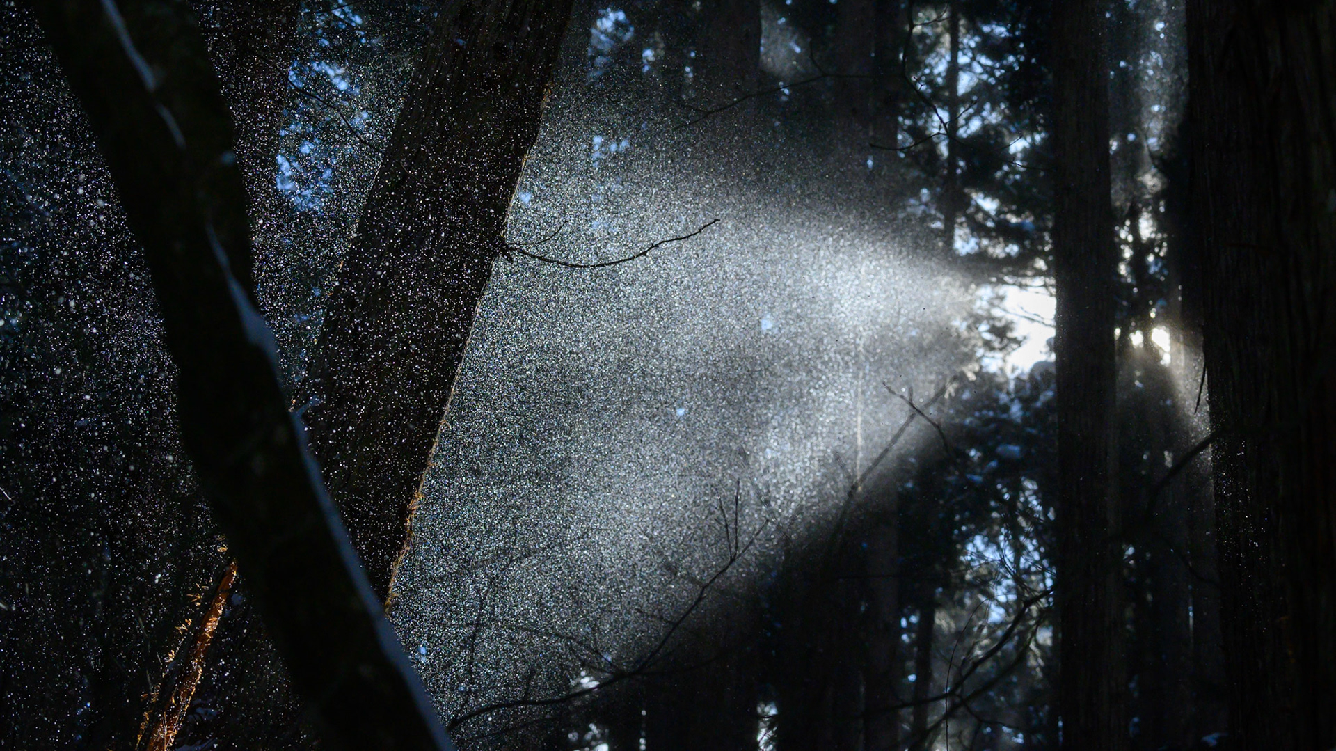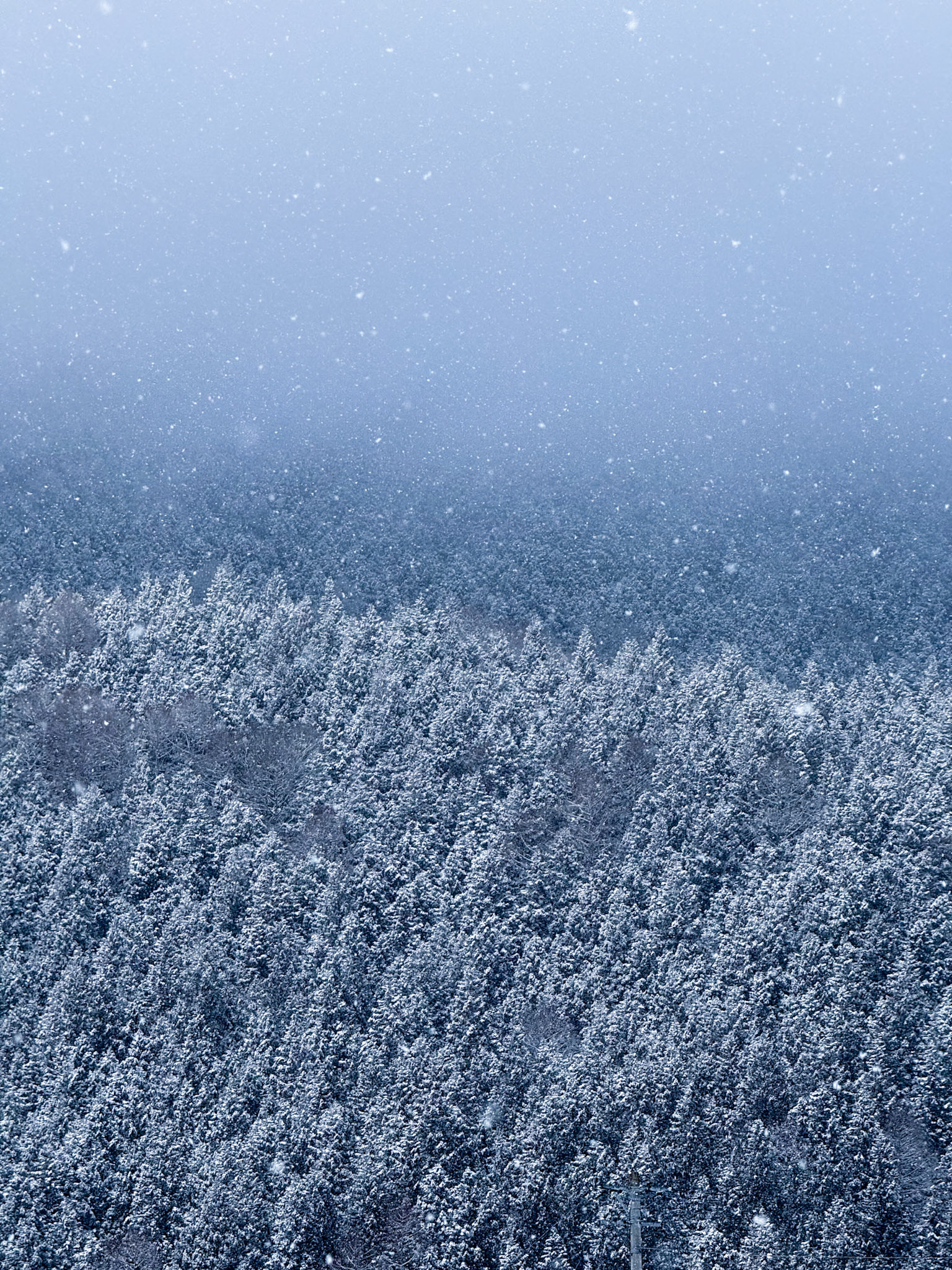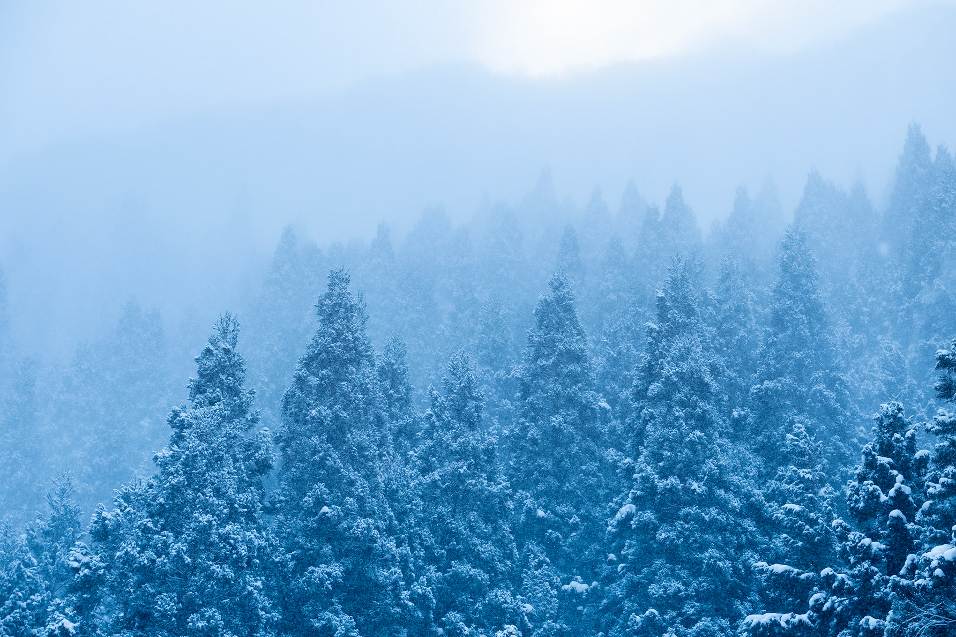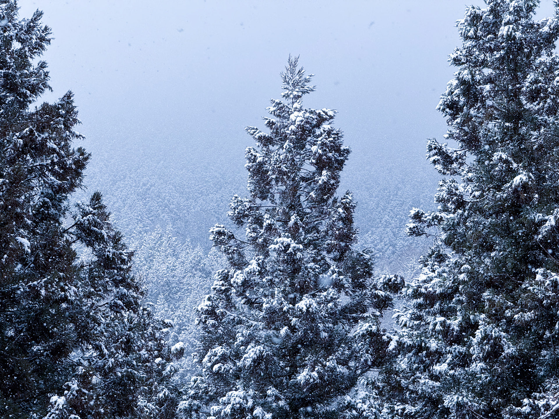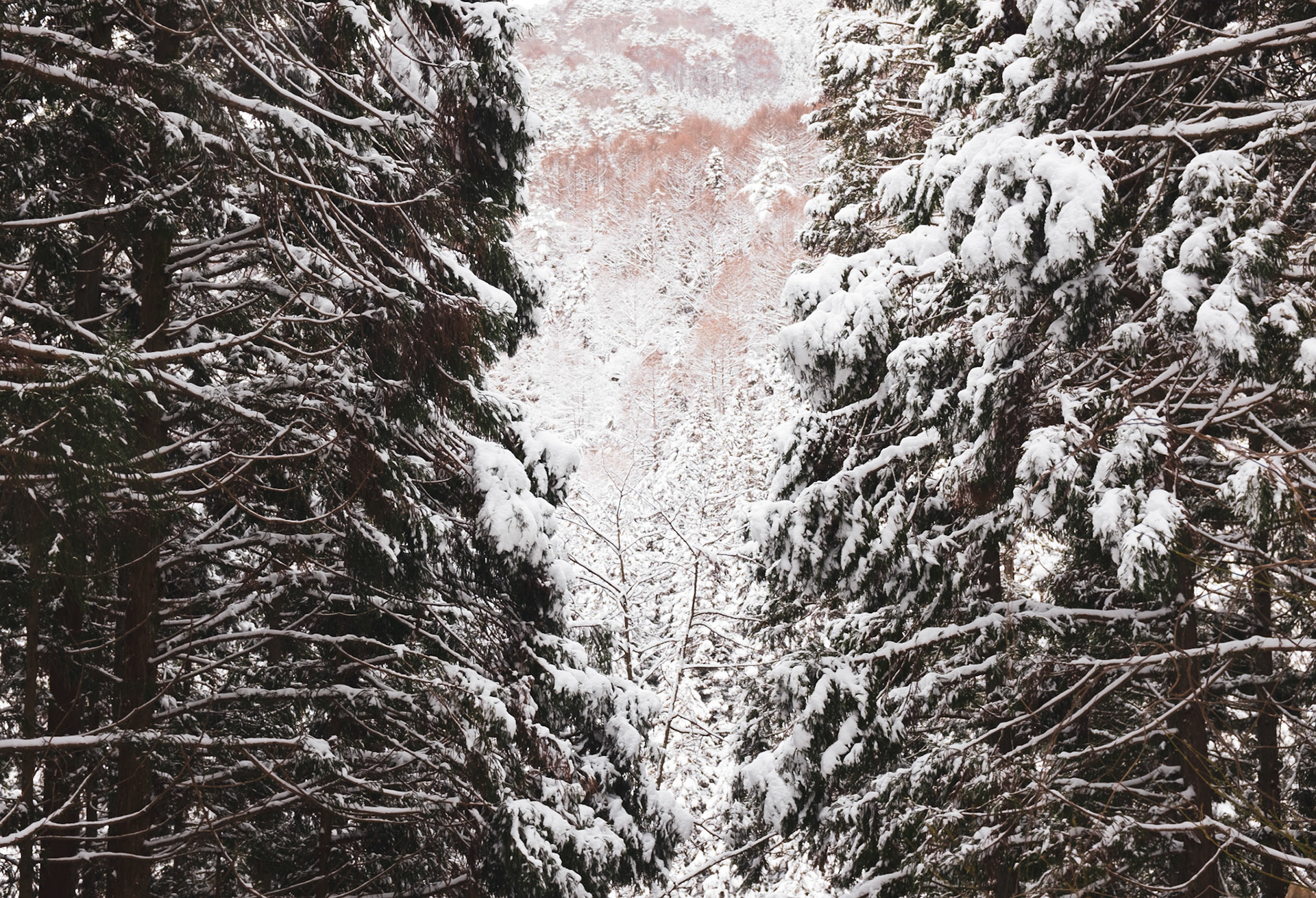 Large amount of snow resting atop Japanese trees in Nagano.