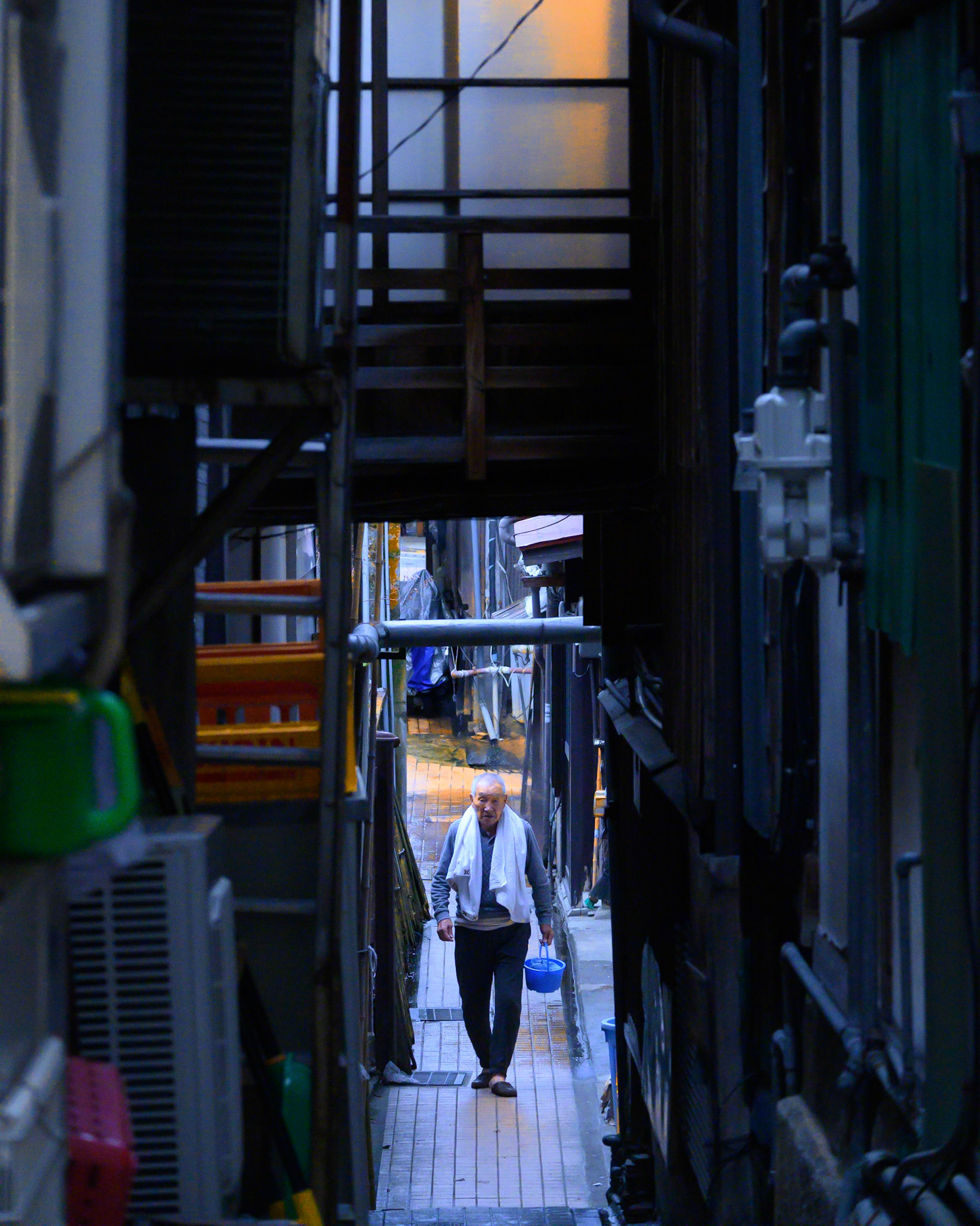 Man walking to a natural hotspring bath in the mountain village of Shibu Onsen.