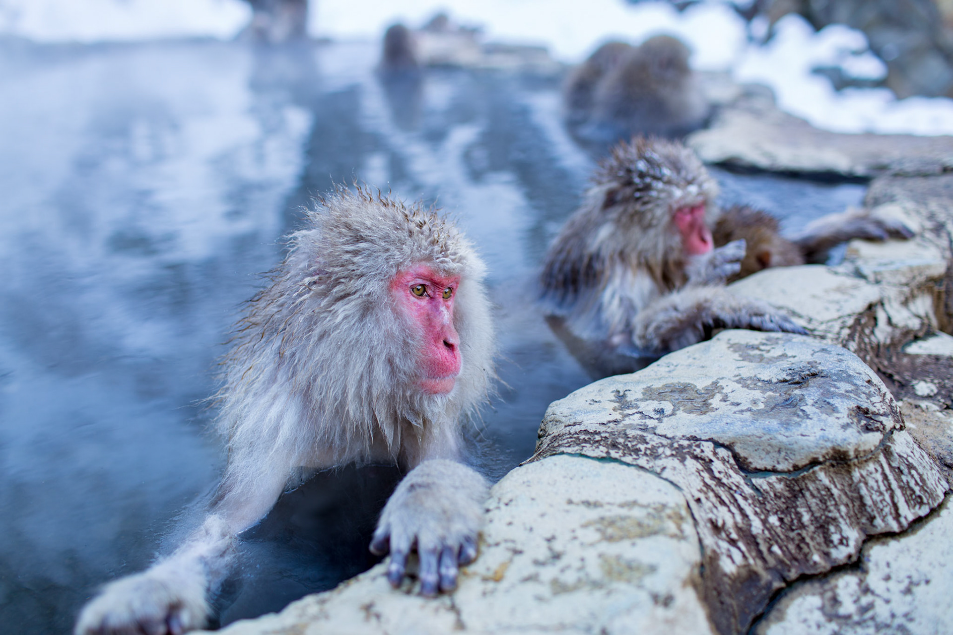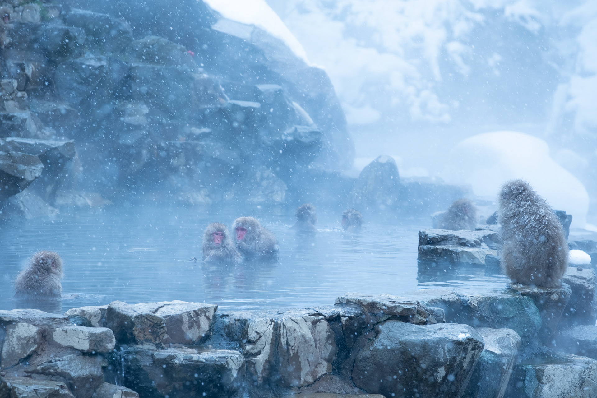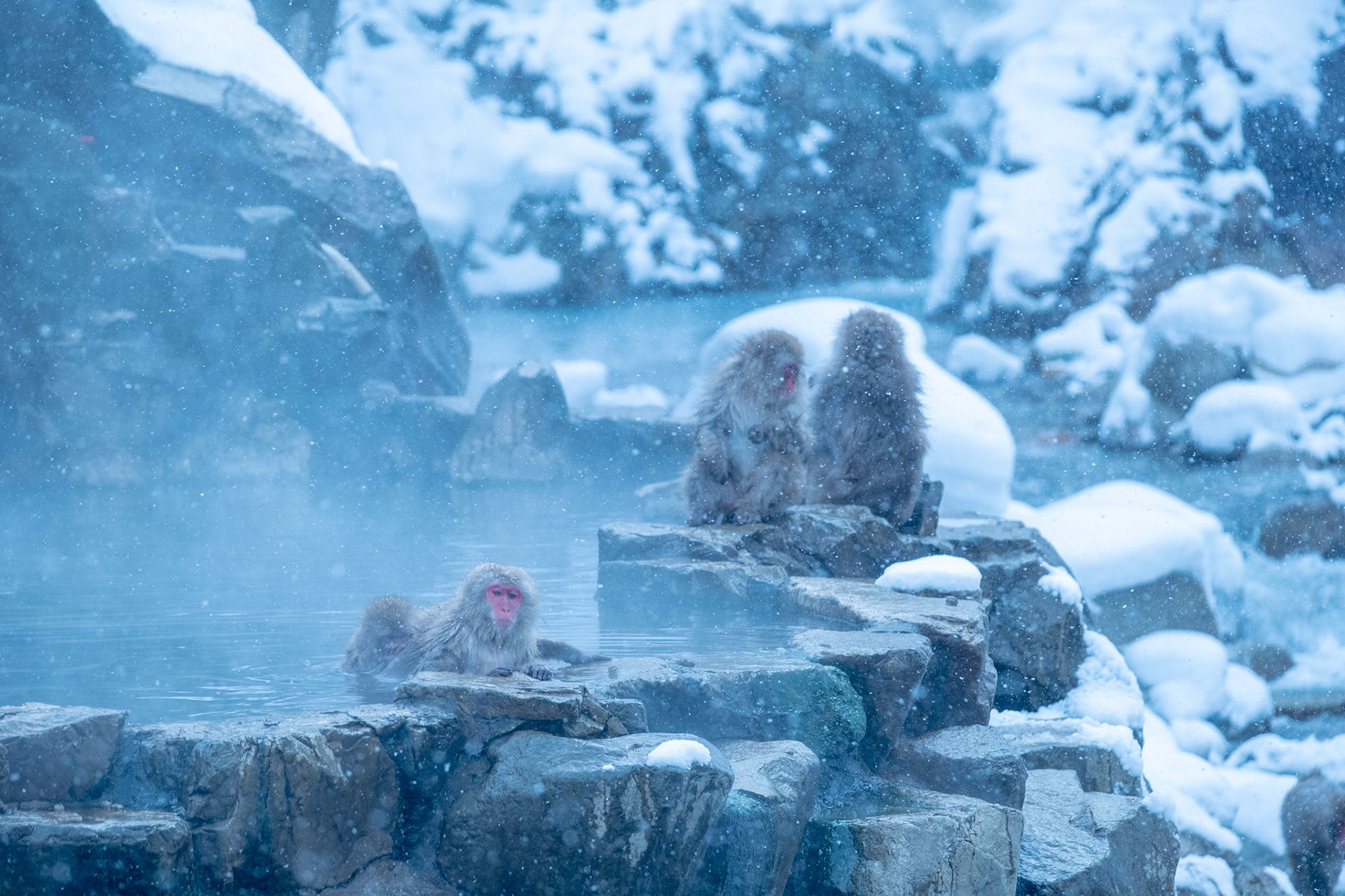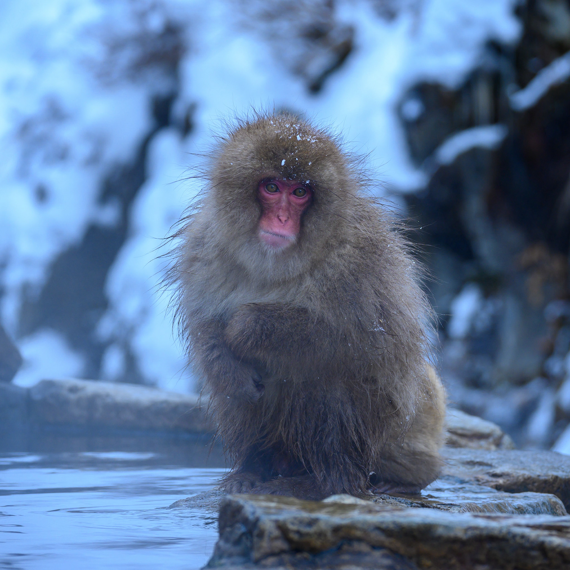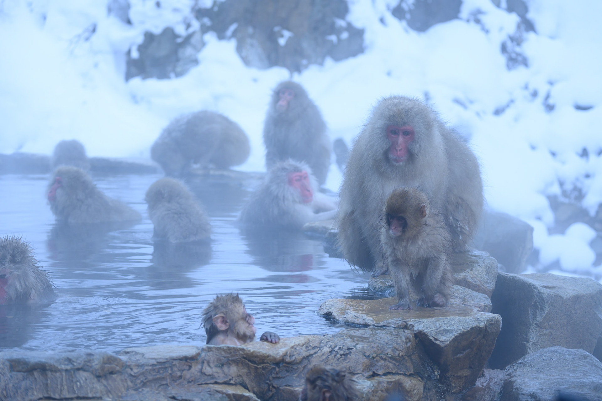 Japanese Snow Monkeys in the winter. To stay warm they often soak in the hotspring water.