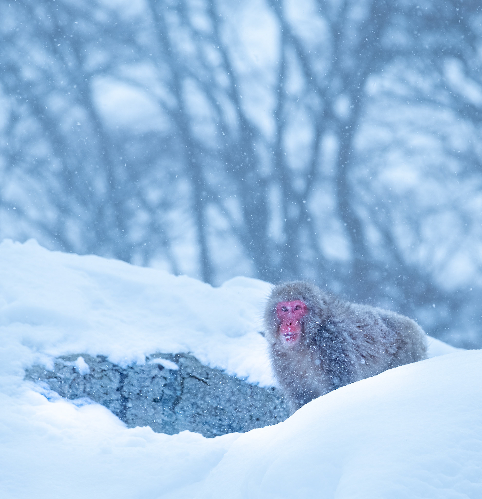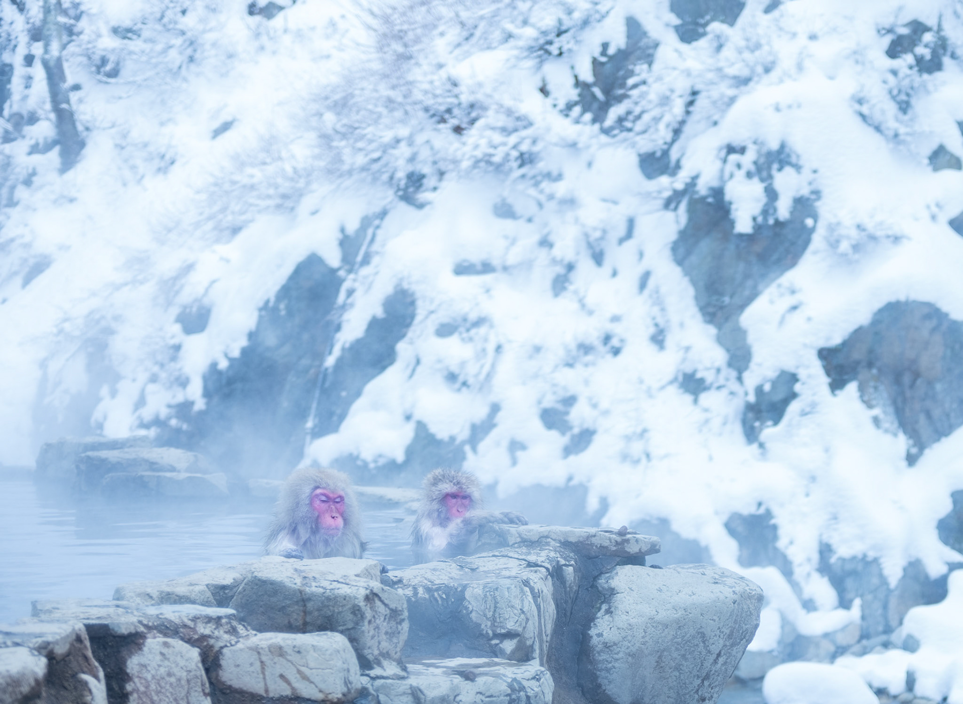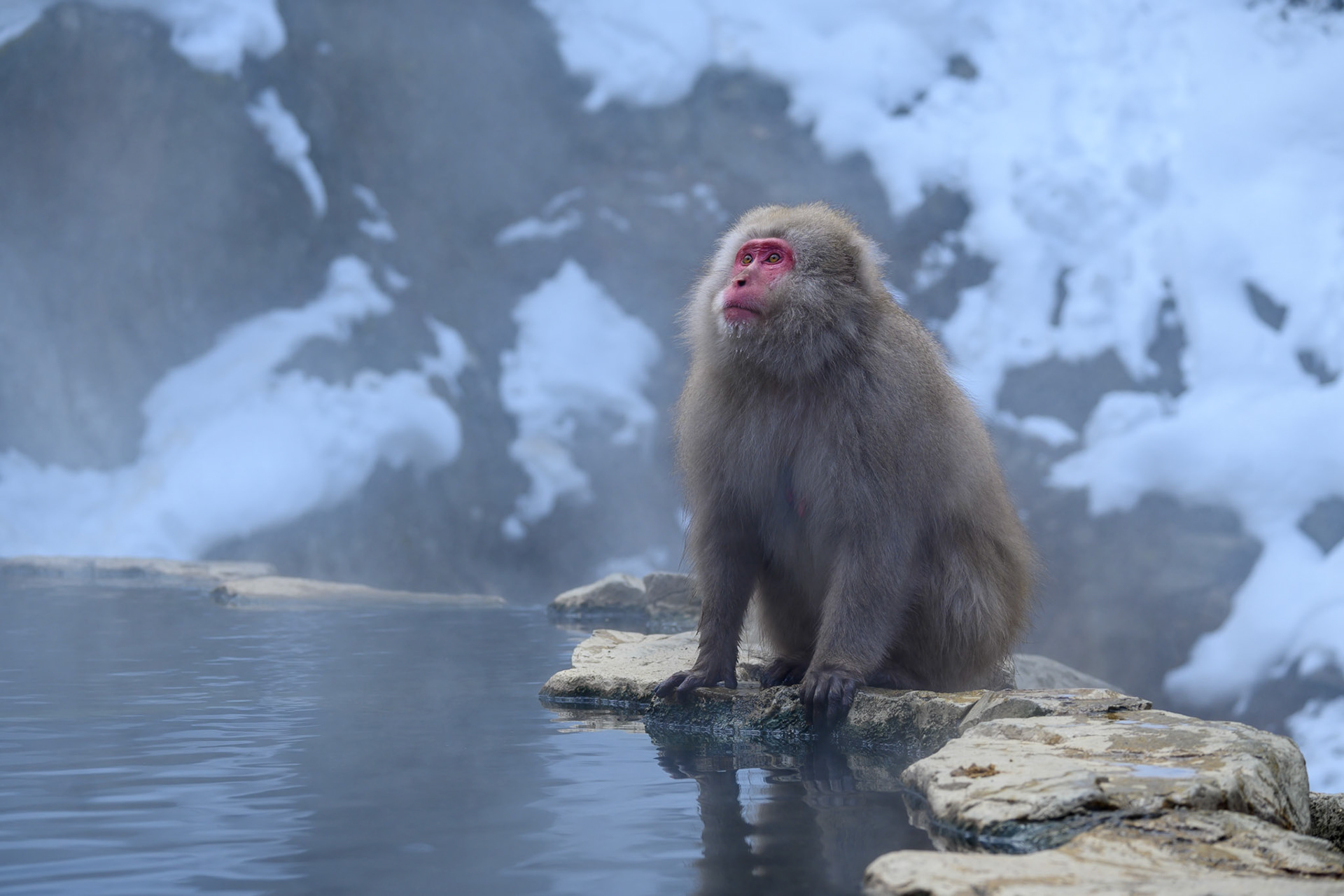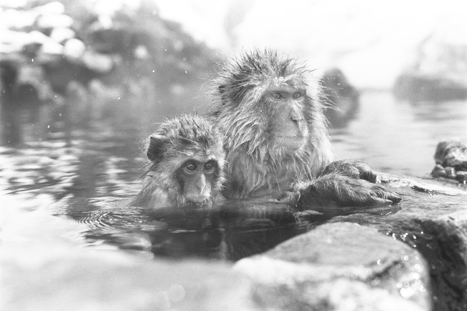 Japanese Snow Monkeys in the winter. To stay warm they often soak in the hotspring water.