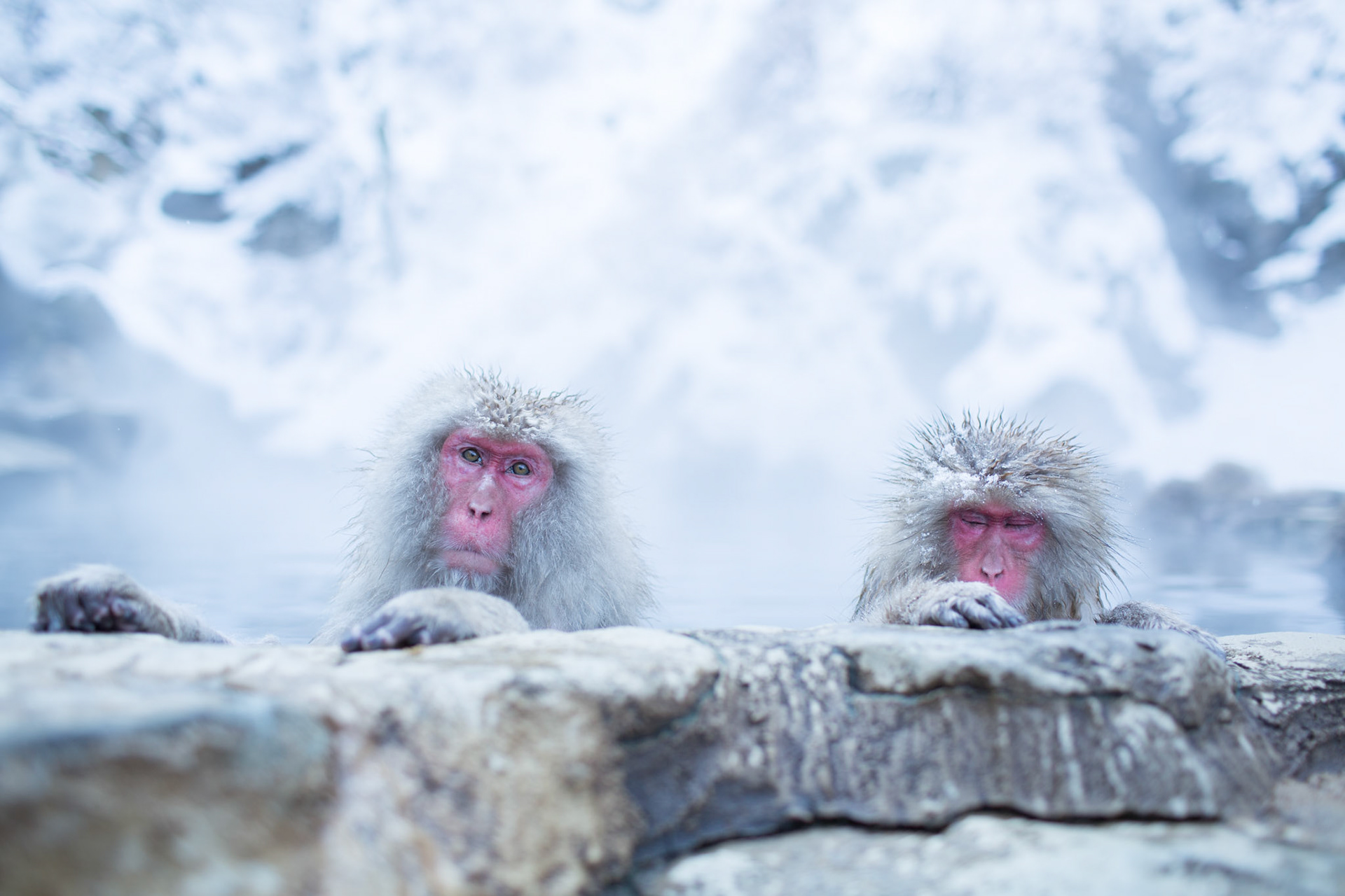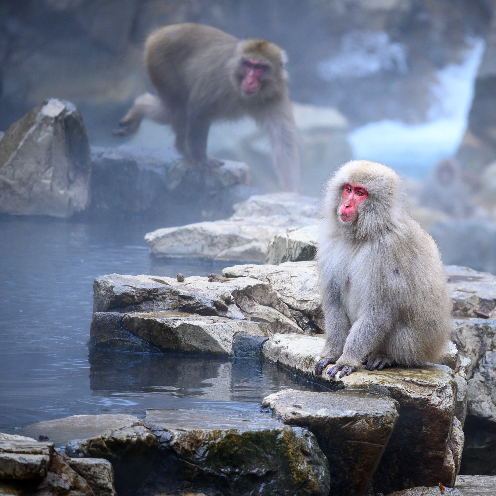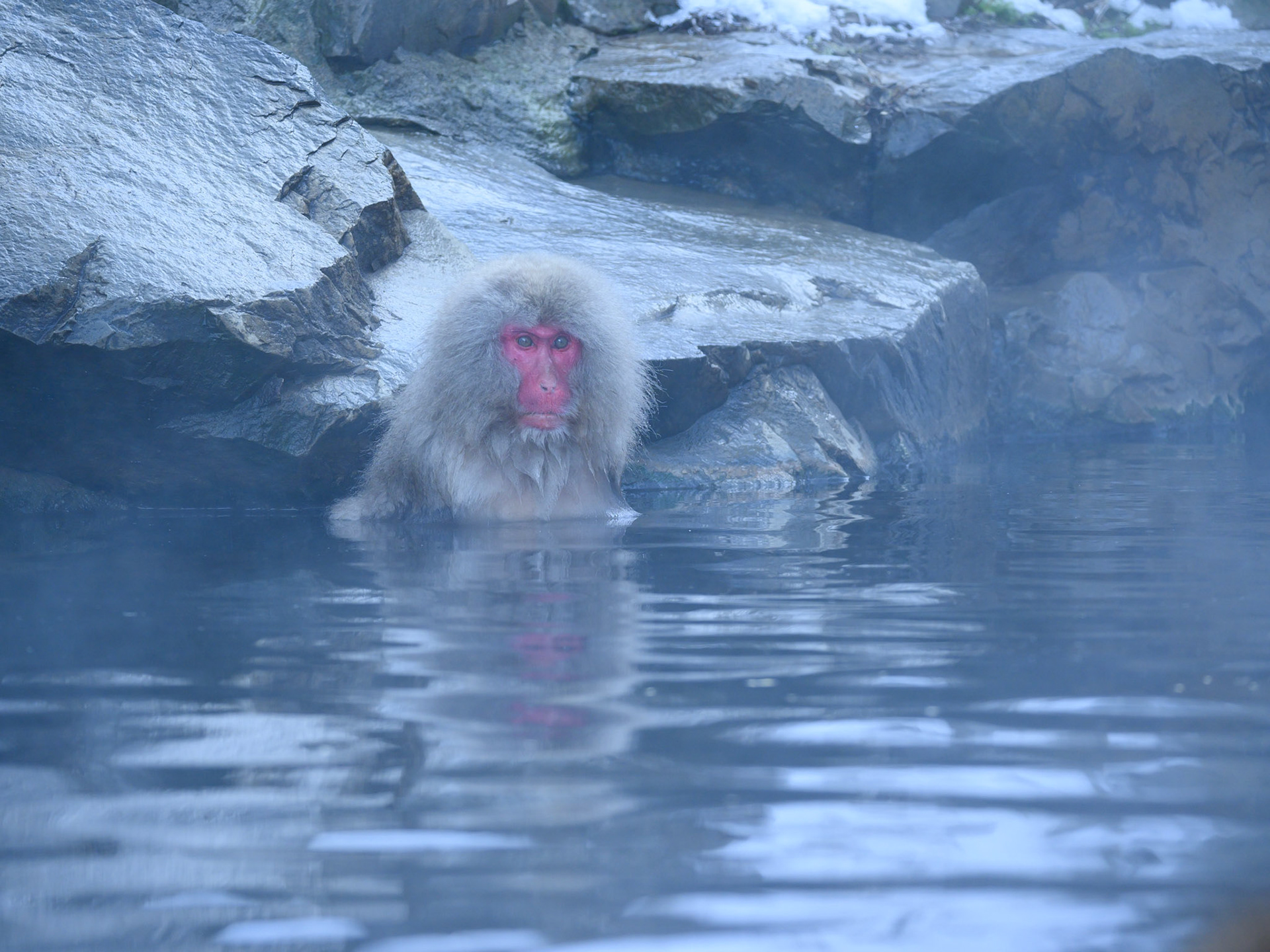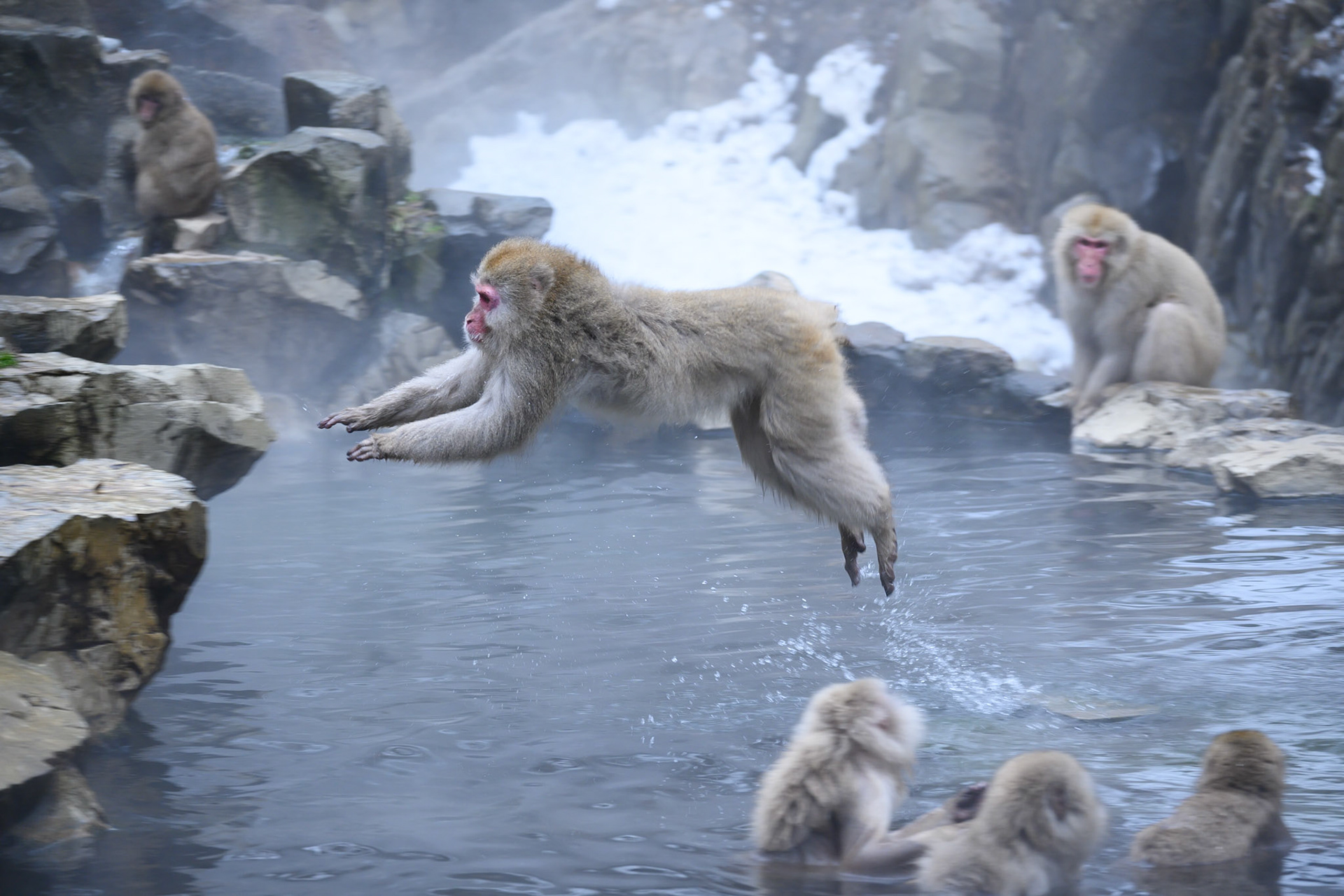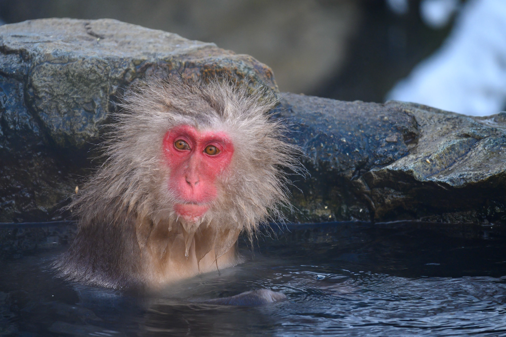 Japanese Snow Monkeys in the winter. To stay warm they often soak in the hotspring water.