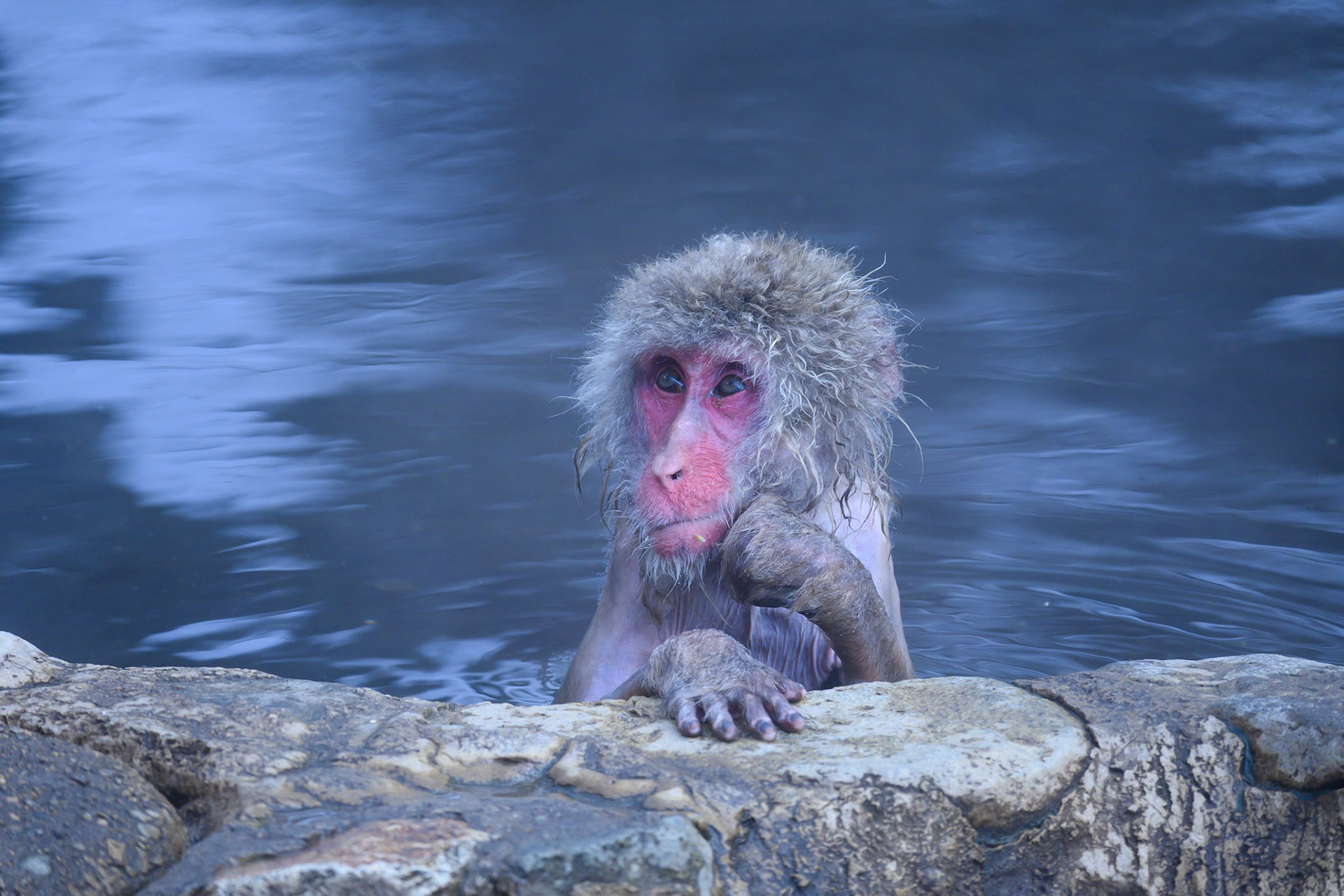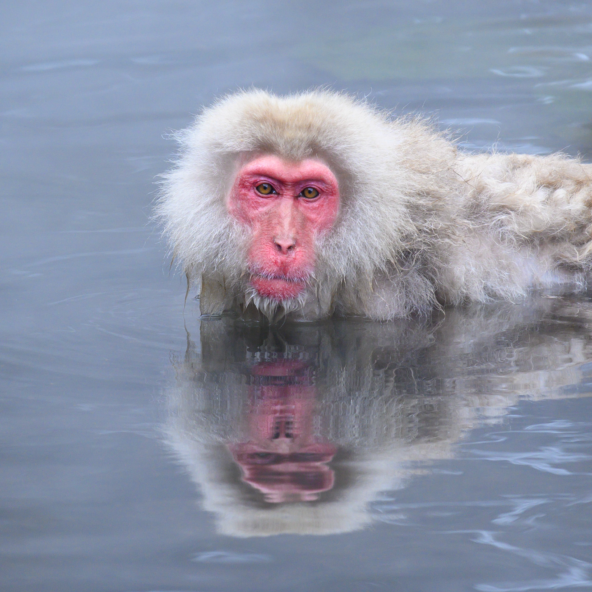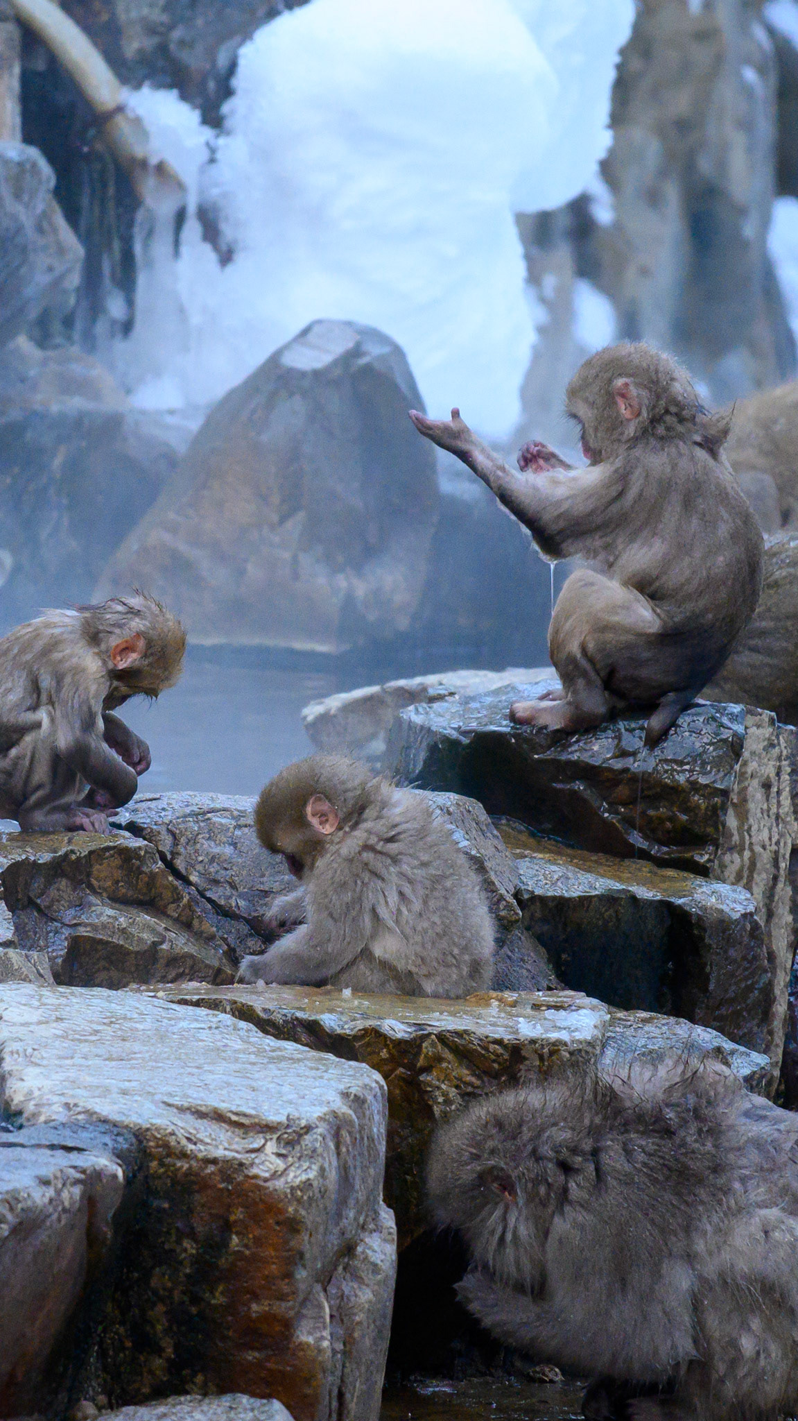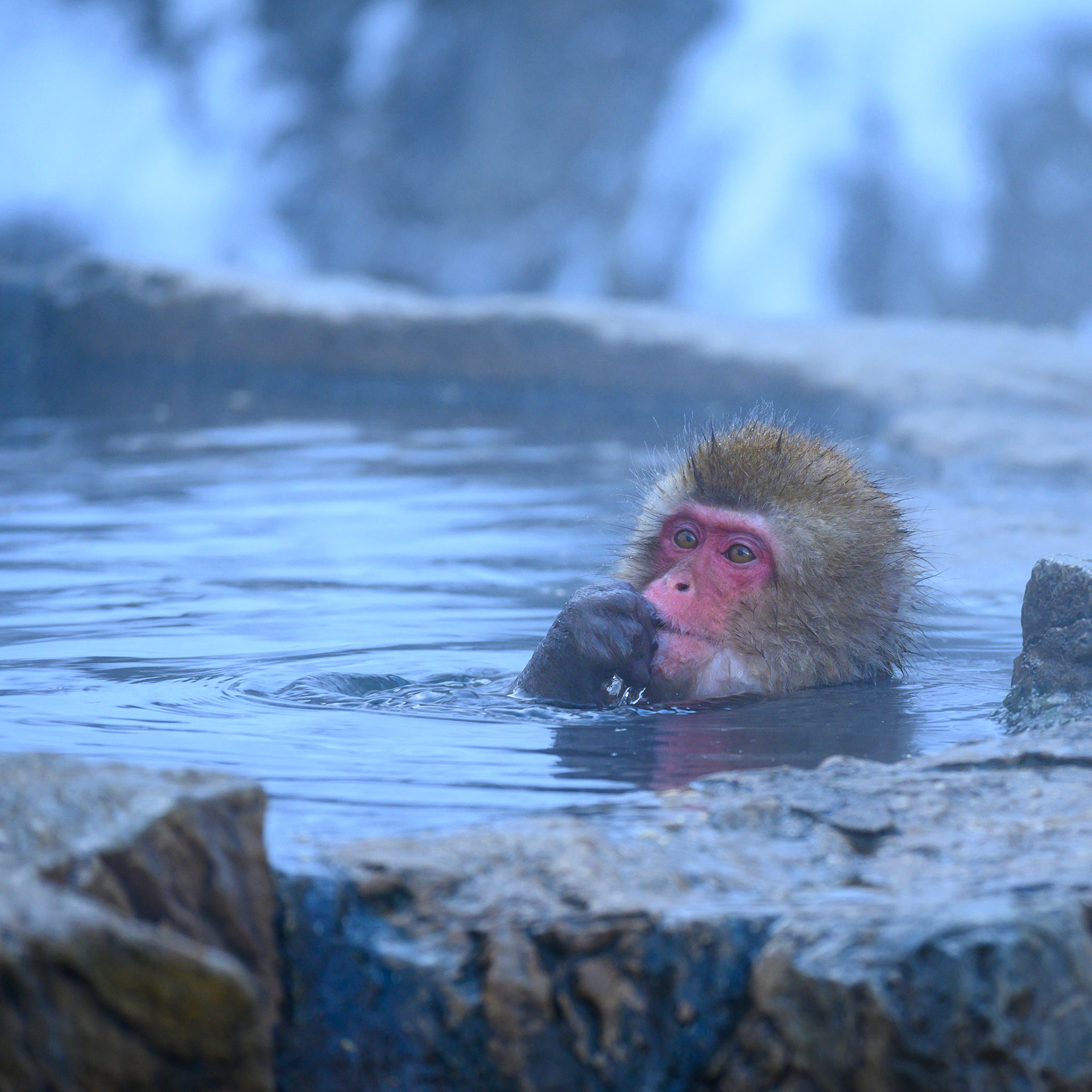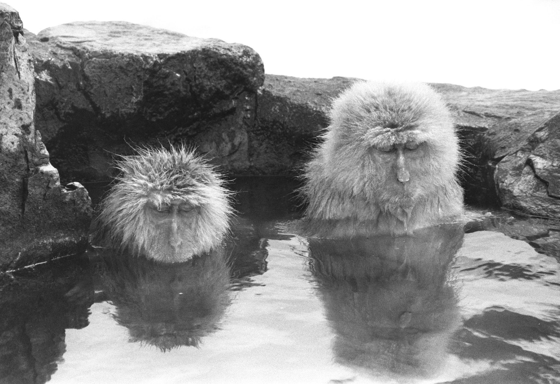Japanese Snow Monkeys in the winter. To stay warm they often soak in the hotspring water.