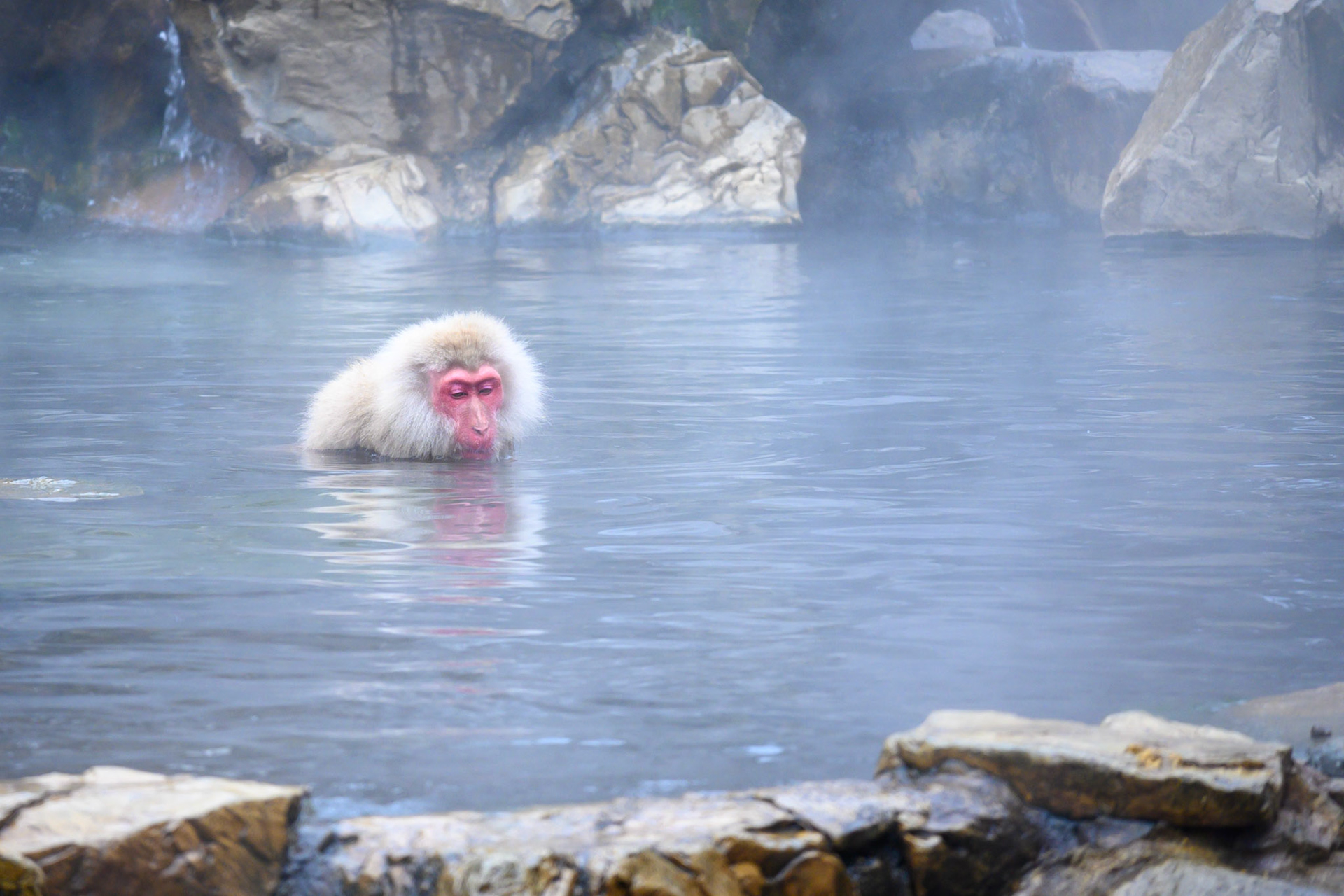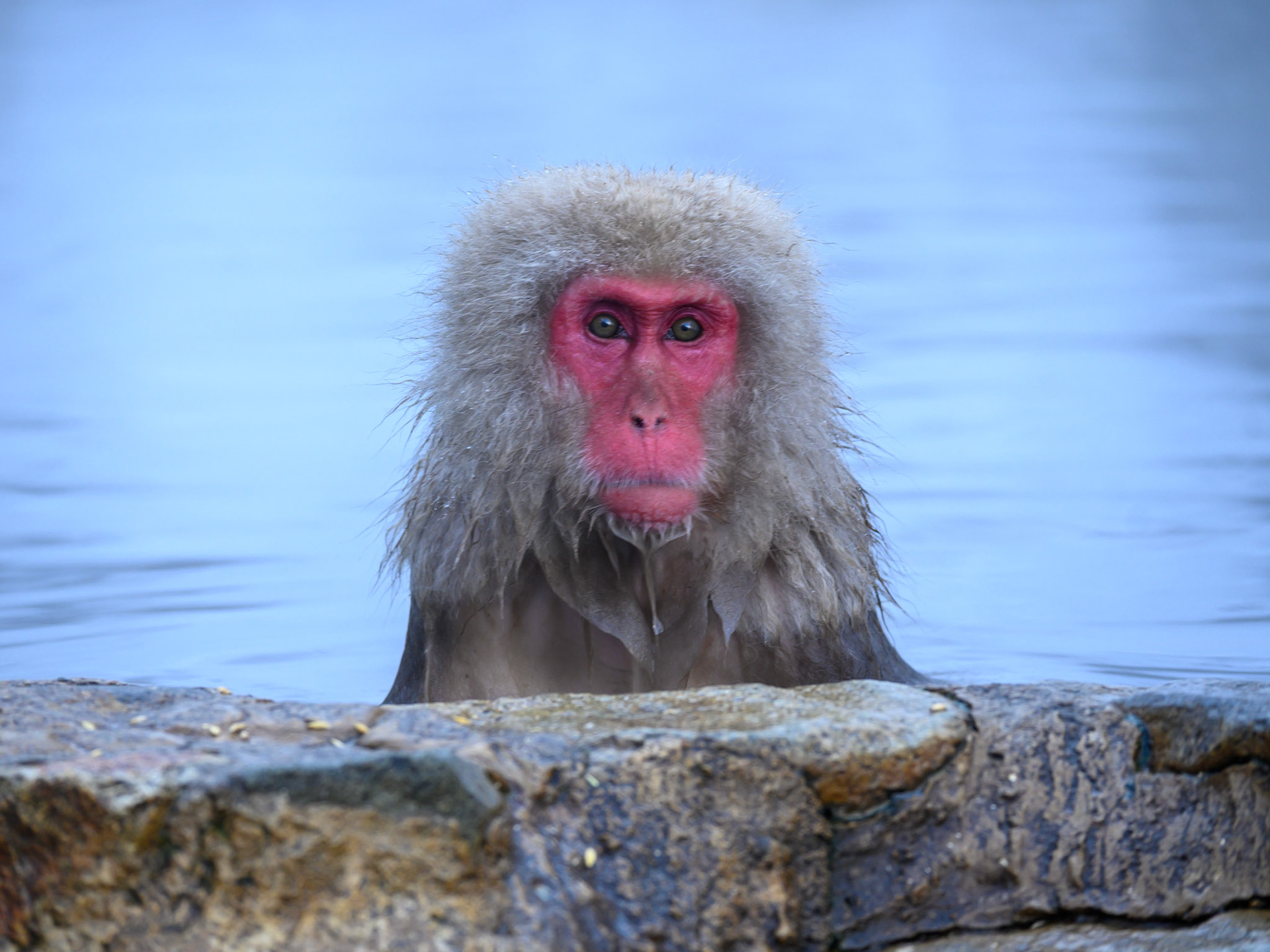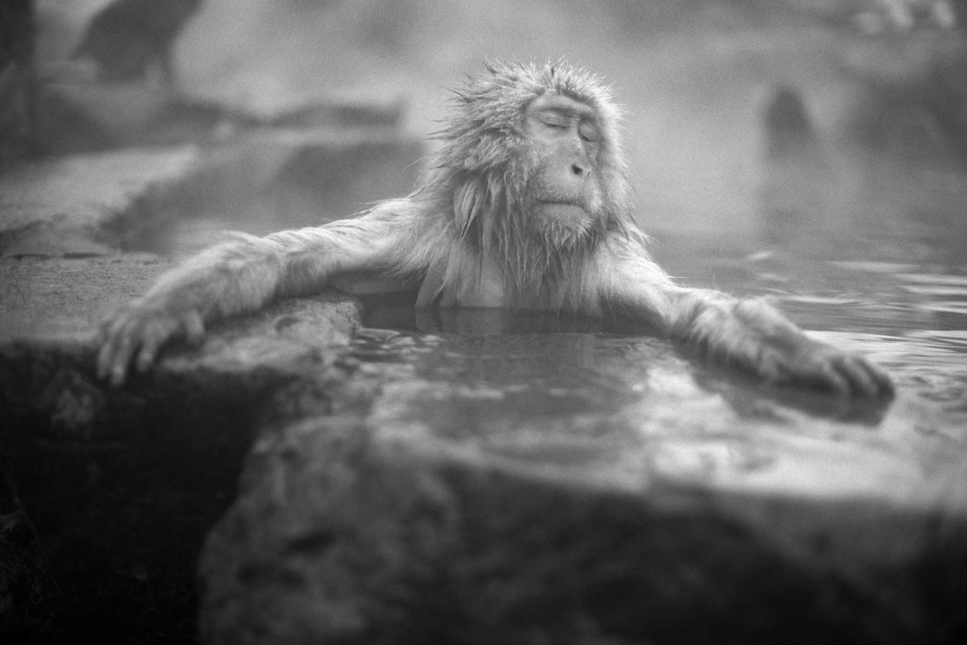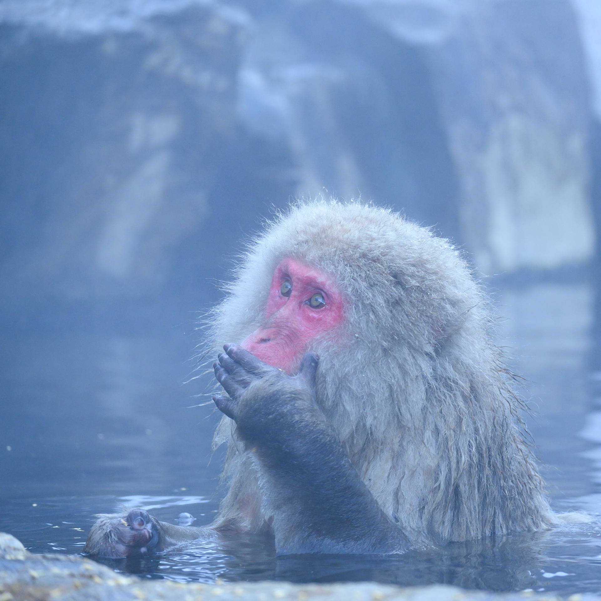 Japanese Snow Monkeys in the winter. To stay warm they often soak in the hotspring water.
